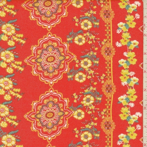 Coral Red/Gold Medallion Stripe Rayon Challis Fabric