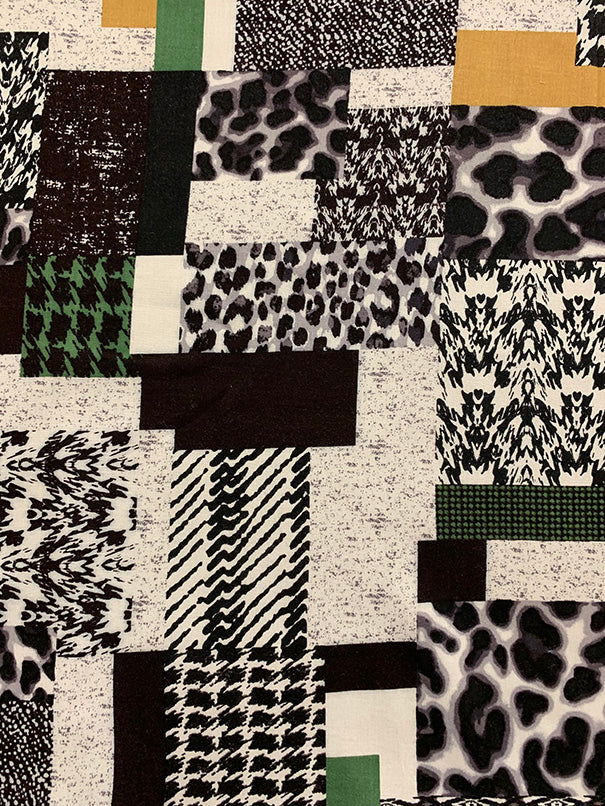 Green and Gold Patchwork Print Rayon Challis Fabric