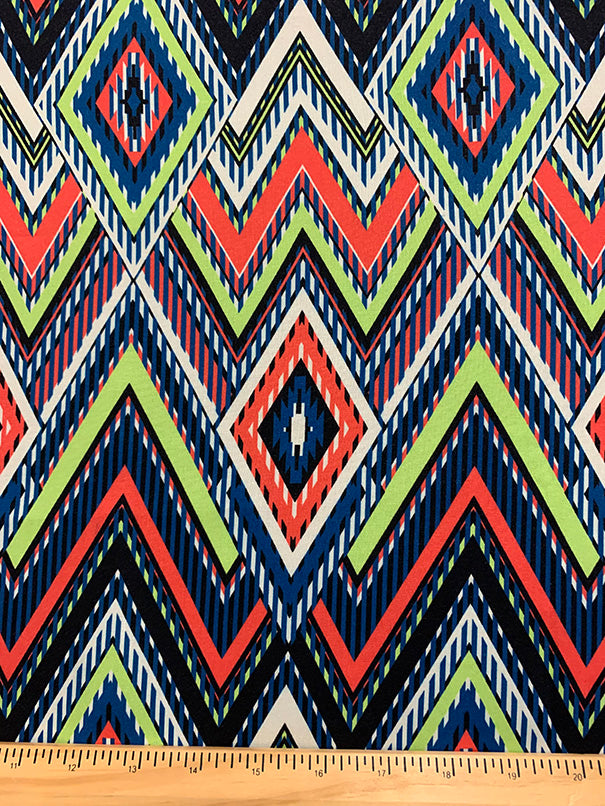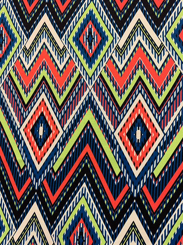 -Lime Green, Blue, White, Orange, & Black Multi Diamond Print Rayon Challis Fabric