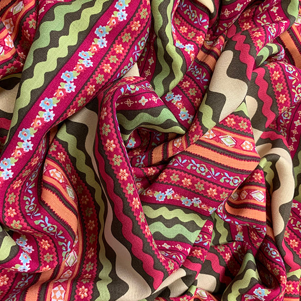 Magenta Multi Stripe Print Rayon Challis Fabric