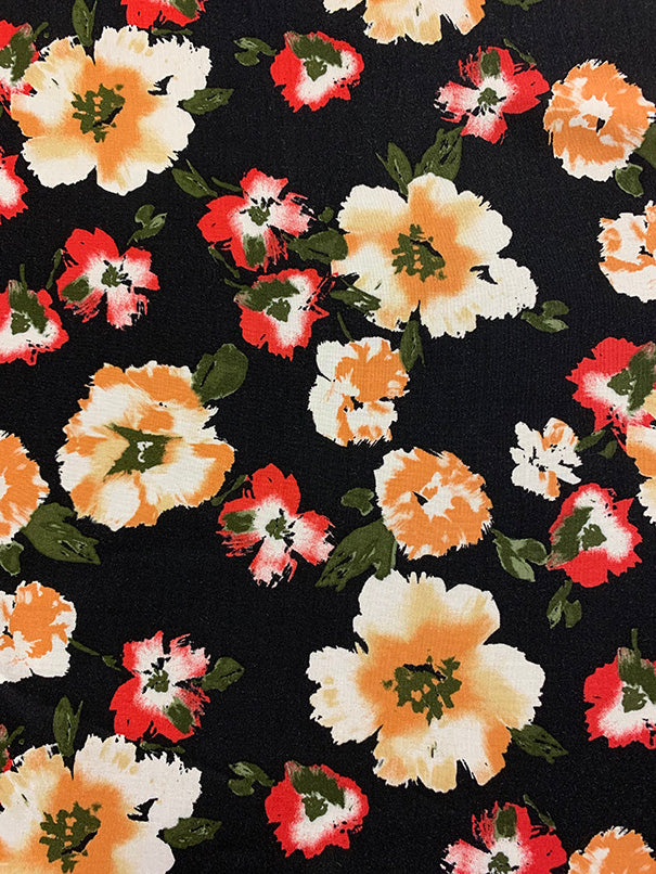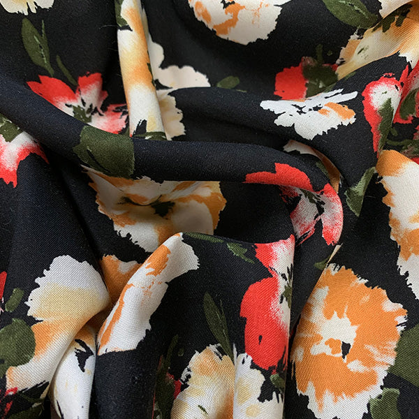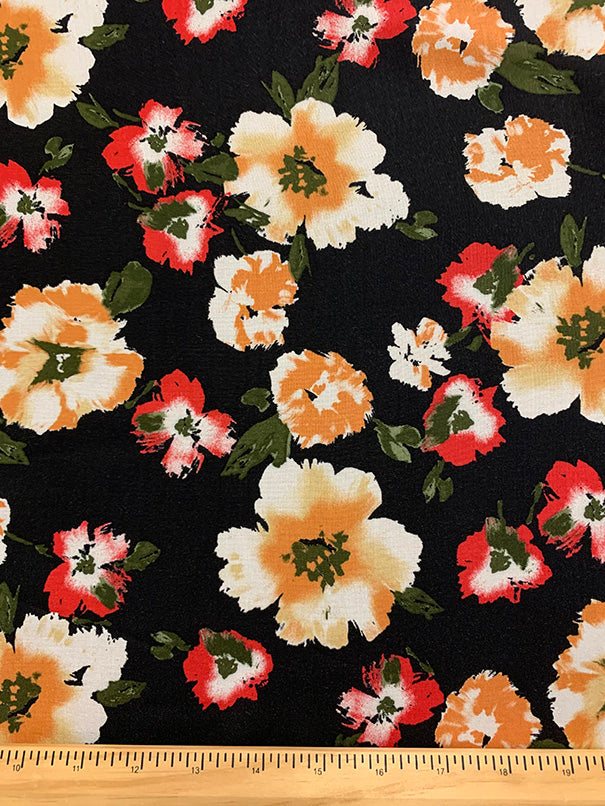 -Orange, Red, Green, & Ivory Floral Print on Black Rayon Challis Fabric