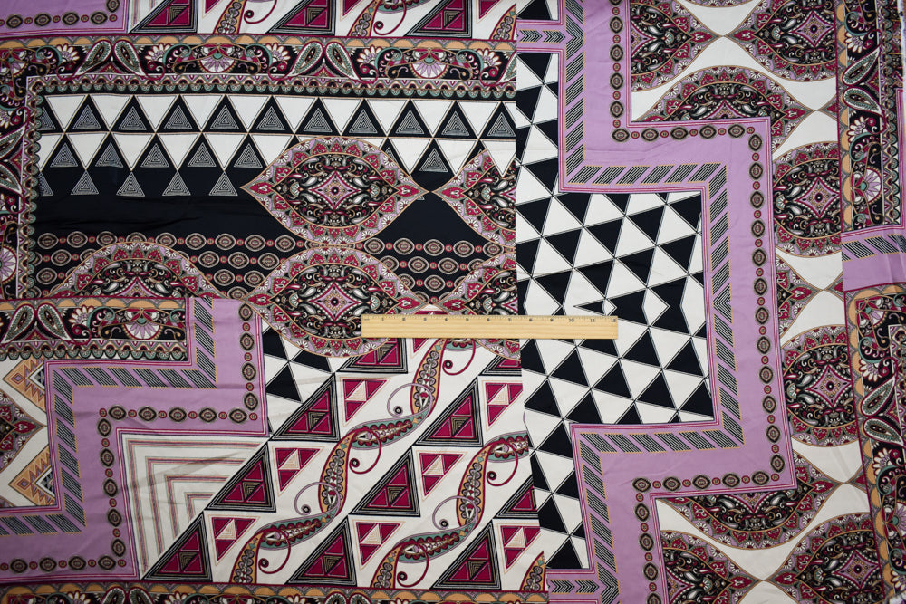 Purple-Beige-Multi Polyester Multi Pattern Border Printed Charmeuse Woven Fabric