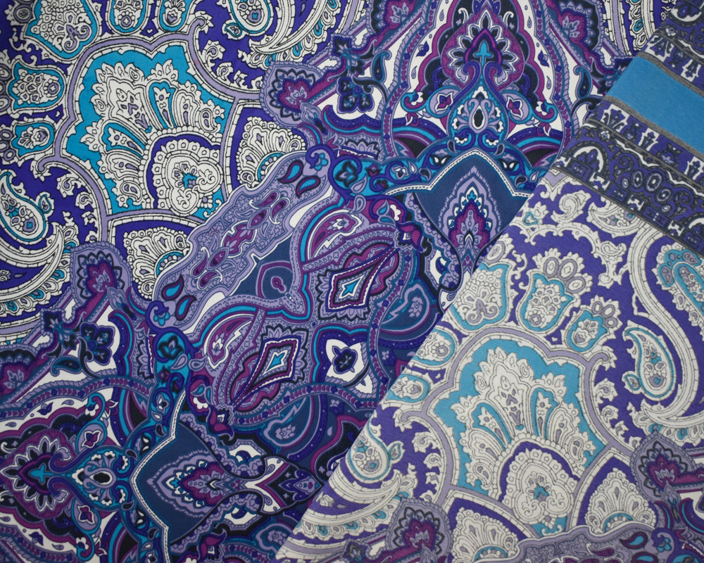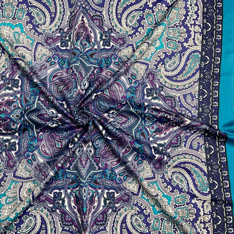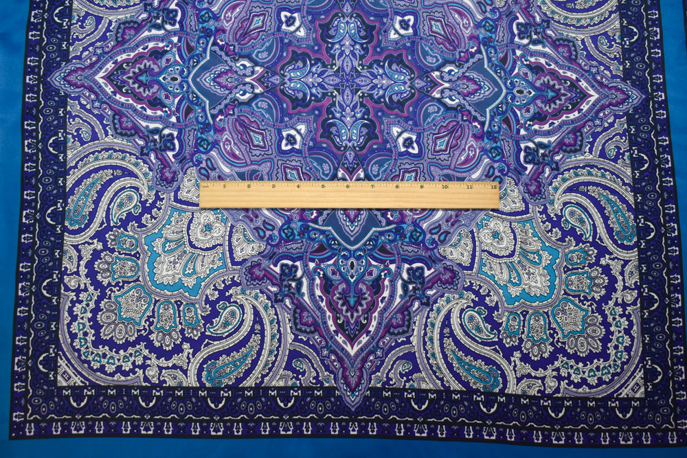 -Turquoise-Purple-Multi Poly Paisley Bandana PANEL Printed Charmeuse Woven Fabric