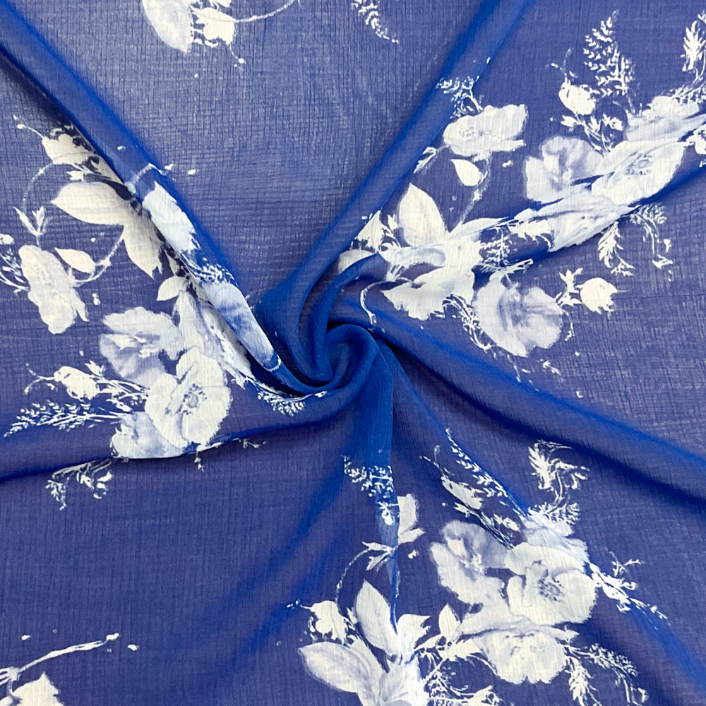 -Blue-White Poly Floral Printed Chiffon Woven Fabric