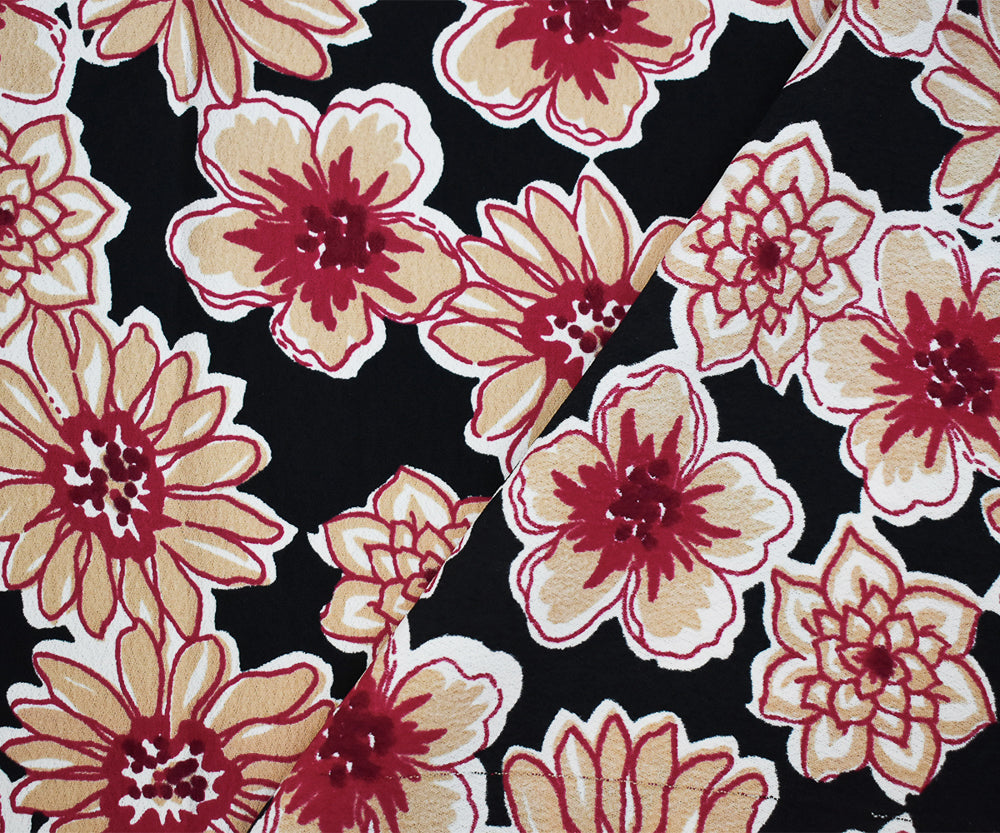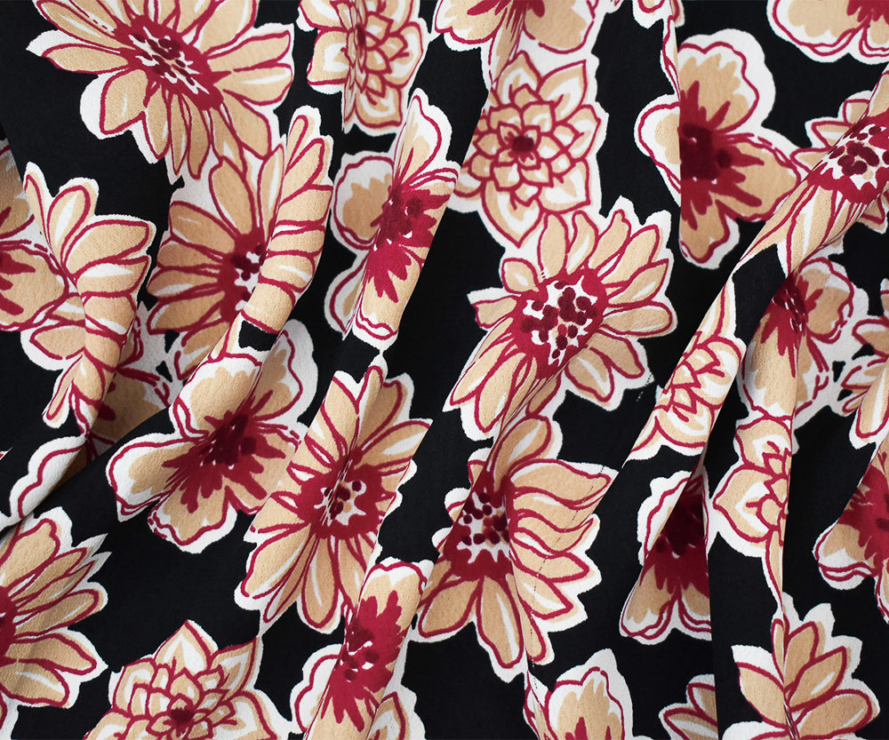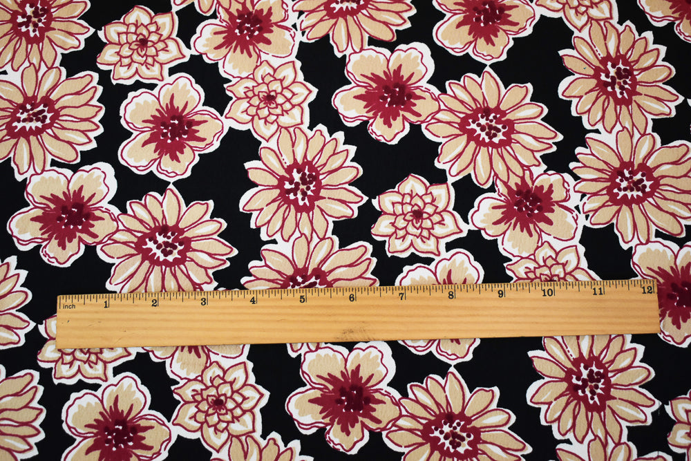 Black-Red-Beige Floral Printed Rayon Crepe Faille Woven Fabric
