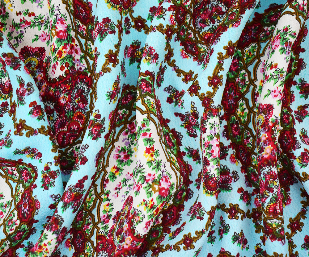 Blue-Red-Multi Floral Frame Trellis Printed Rayon Crepe Faille Fabric
