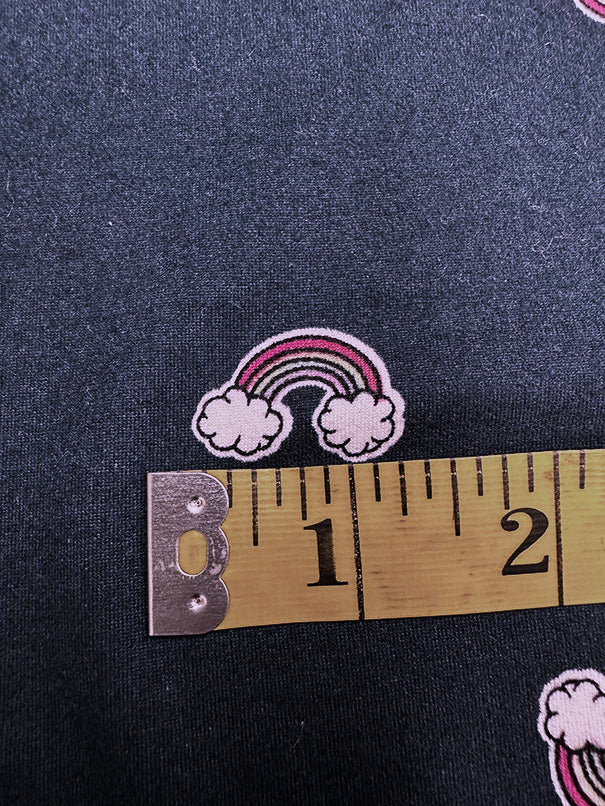 -Black, White, Pink, Yellow, Green, & Purple Rainbow Print on Navy Blue Double Brushed Jersey Knit Fabric