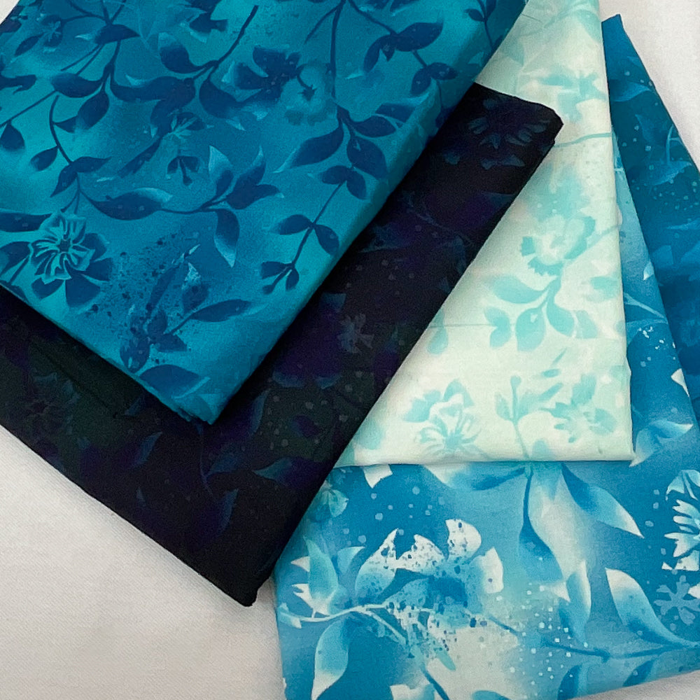 - Bundle fabrics include: 1 1/4 yds teal tonal floral, 1 1/4 yds aqua teal tonal floral, 1 3/4 yds aqua ivory tonal floral, 1 3/4 yds navy green tonal floral, 3 5/8 yds teal blue tonal floral. Pattern is not included