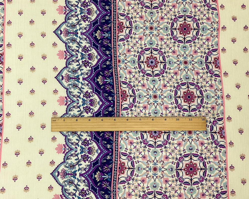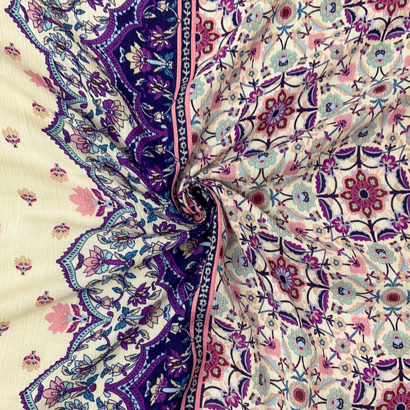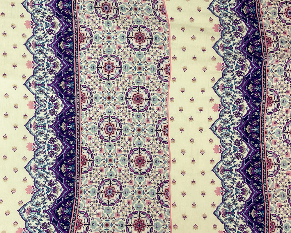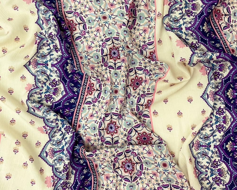Beige-Purple Cotton Floral Baroque Border Print Gauze Woven Fabric
