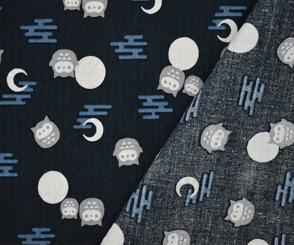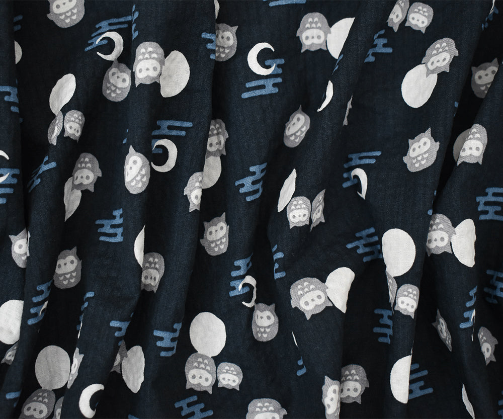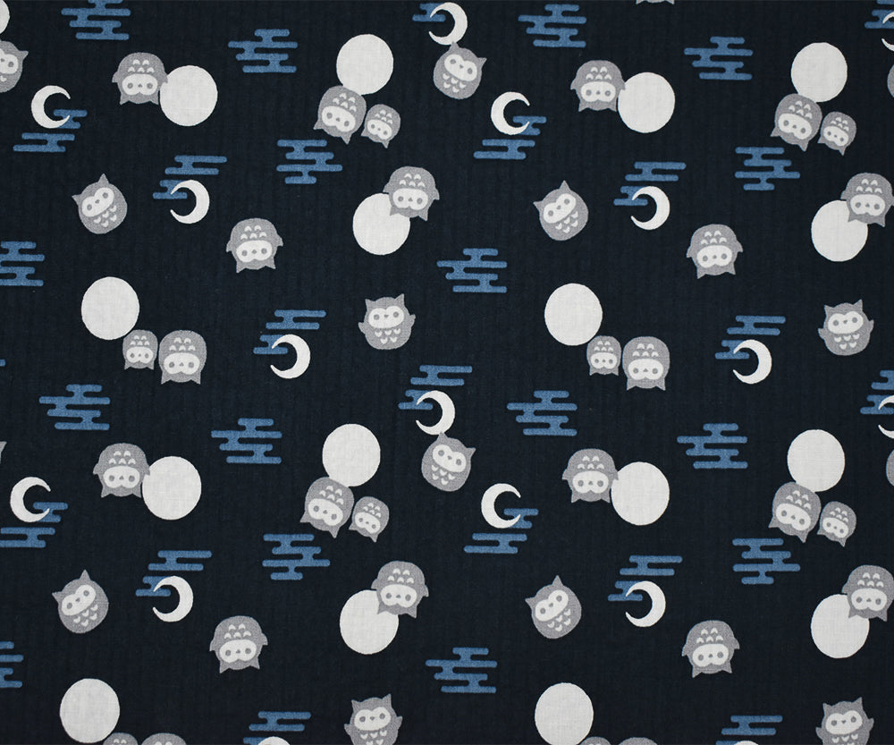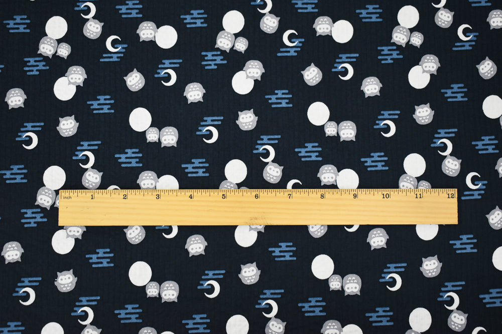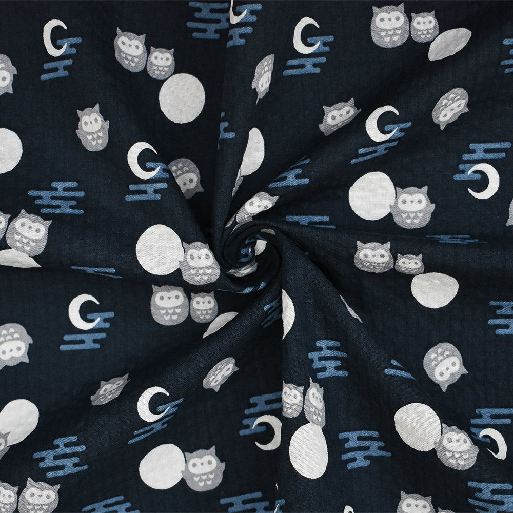 Deep Blue-Gray-Multi Owl Moon Printed Crinkled Cotton Shirting Woven Fabric