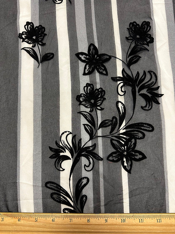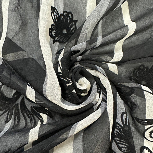 Black Flocked Floral Burnout Stripe Print High Crepe Fabric