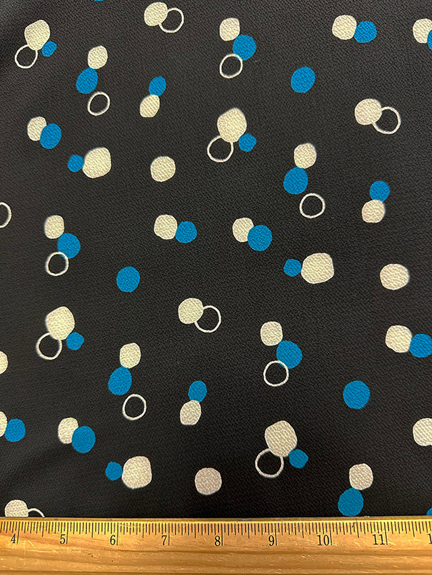 -Ivory & Turquoise Dot Print on Black Poly High Crepe Fabric