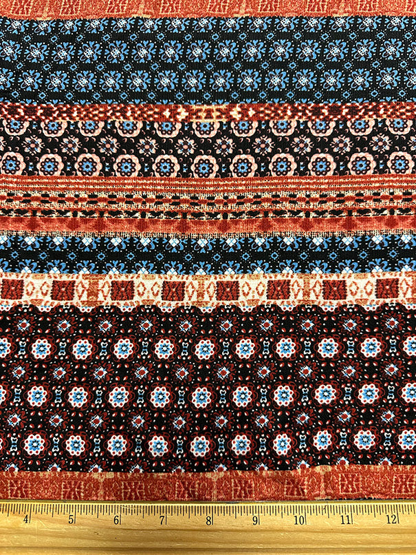 -Black, Red, Gold, White, Pink, & Blue Multi Horizontal Stripe Print High Crepe Fabric