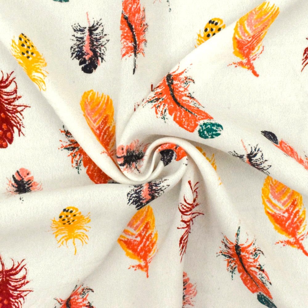 Ivory-Orange-Multi Feather Printed Rayon Crepe Faille Woven Fabric