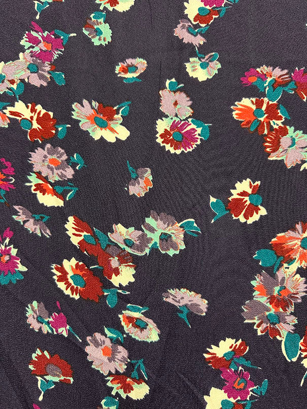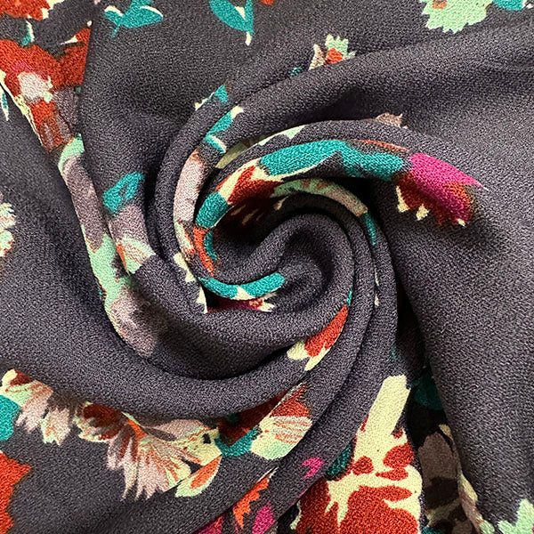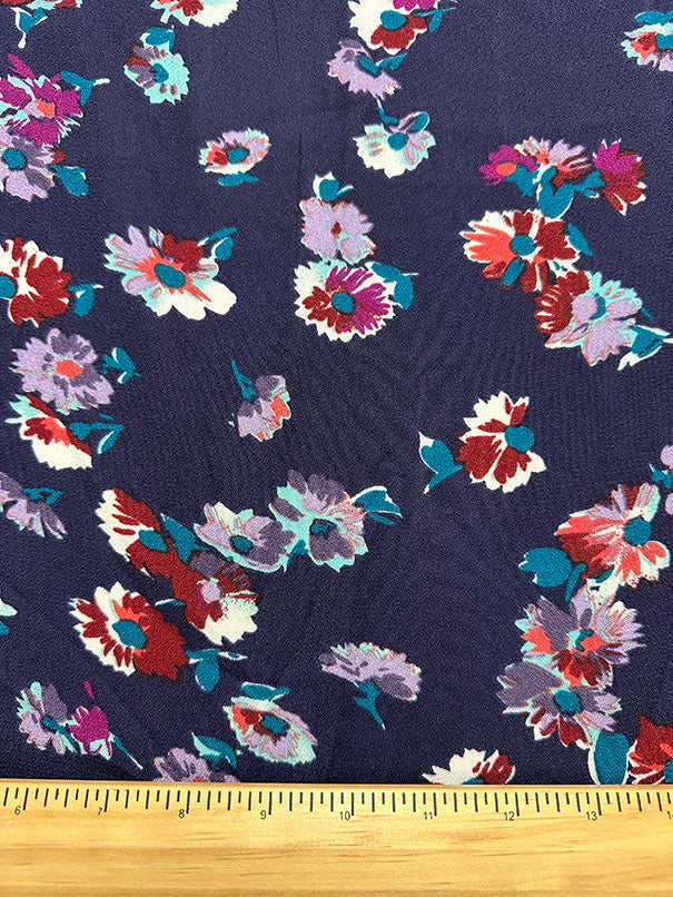 -Maroon, Purple, Orange, White, Teal, Aqua, Magenta,& Lilac Multi Floral Print on Navy Blue Light Weight Dress Crepe Fabric