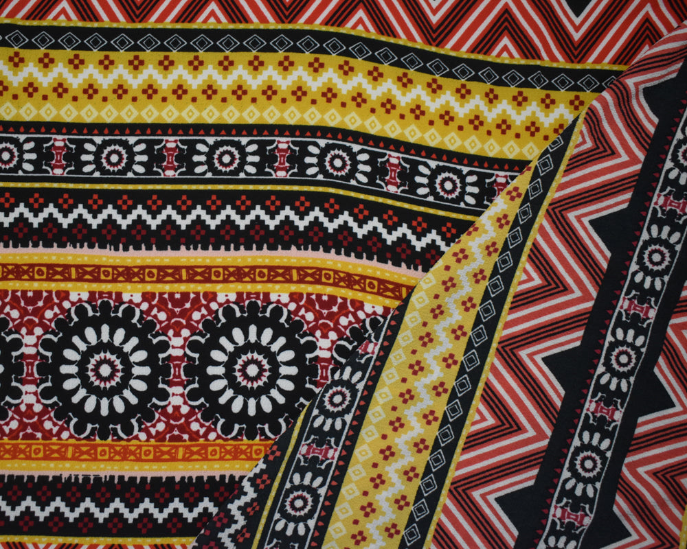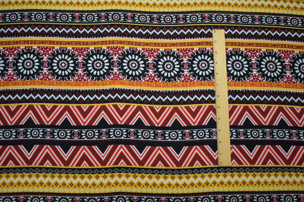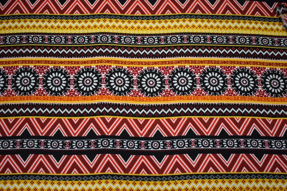 Red-Multi Poly Floral Aztec Stripe Border Printed Pebble Crepe Woven Fabric