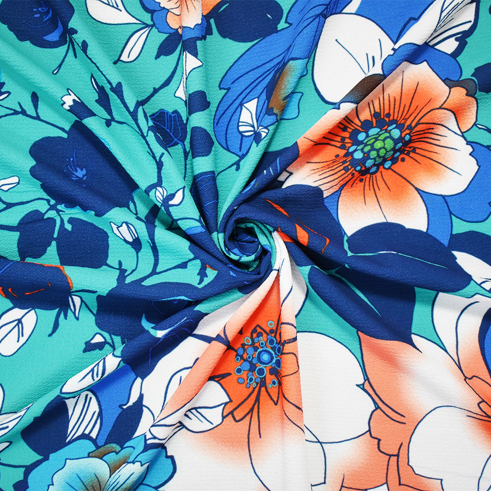 Teal-Orange-Multi Poly Floral Printed Pebble Crepe Woven Fabric
