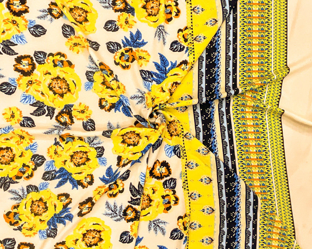 Yellow-Blue-Multi Poly Floral Printed Pebble Crepe Woven Fabric