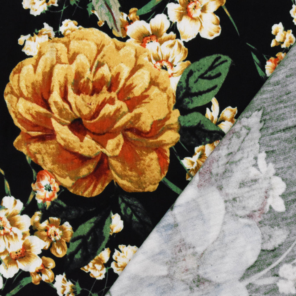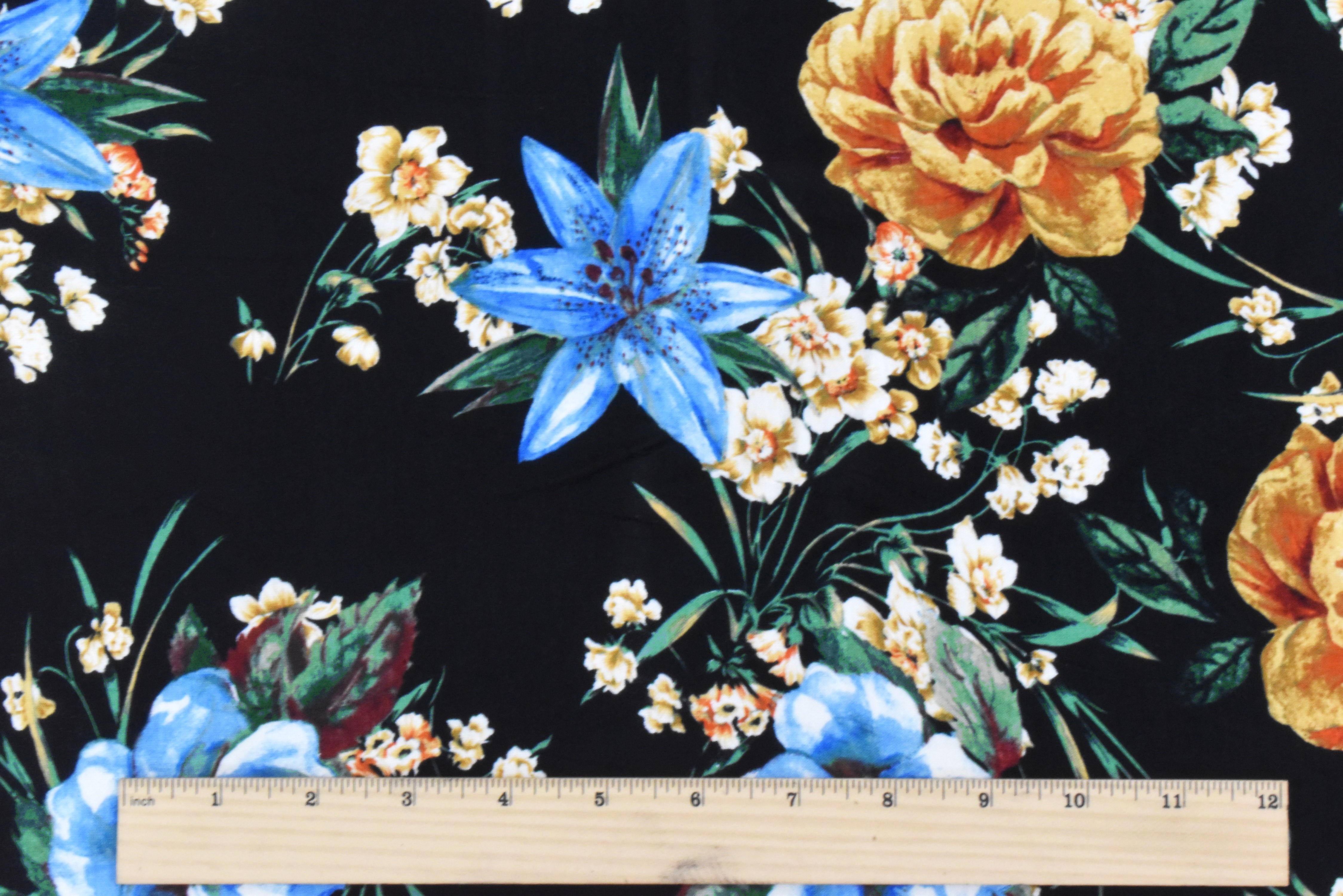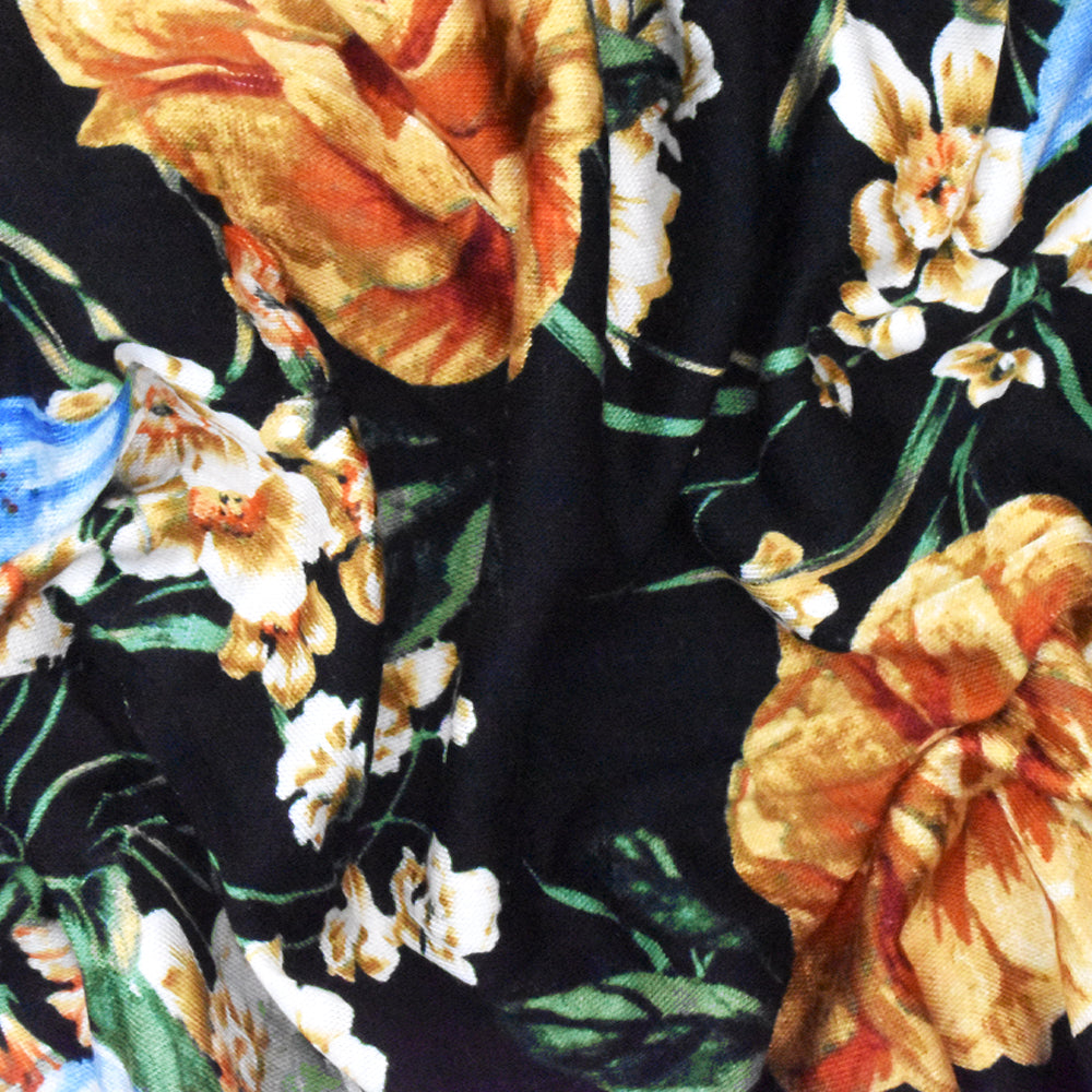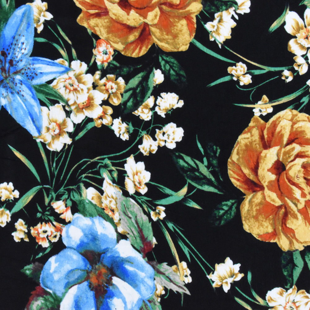 Black-Sky Blue-Multi Floral Printed Rayon Stretch Jersey Knit Fabric