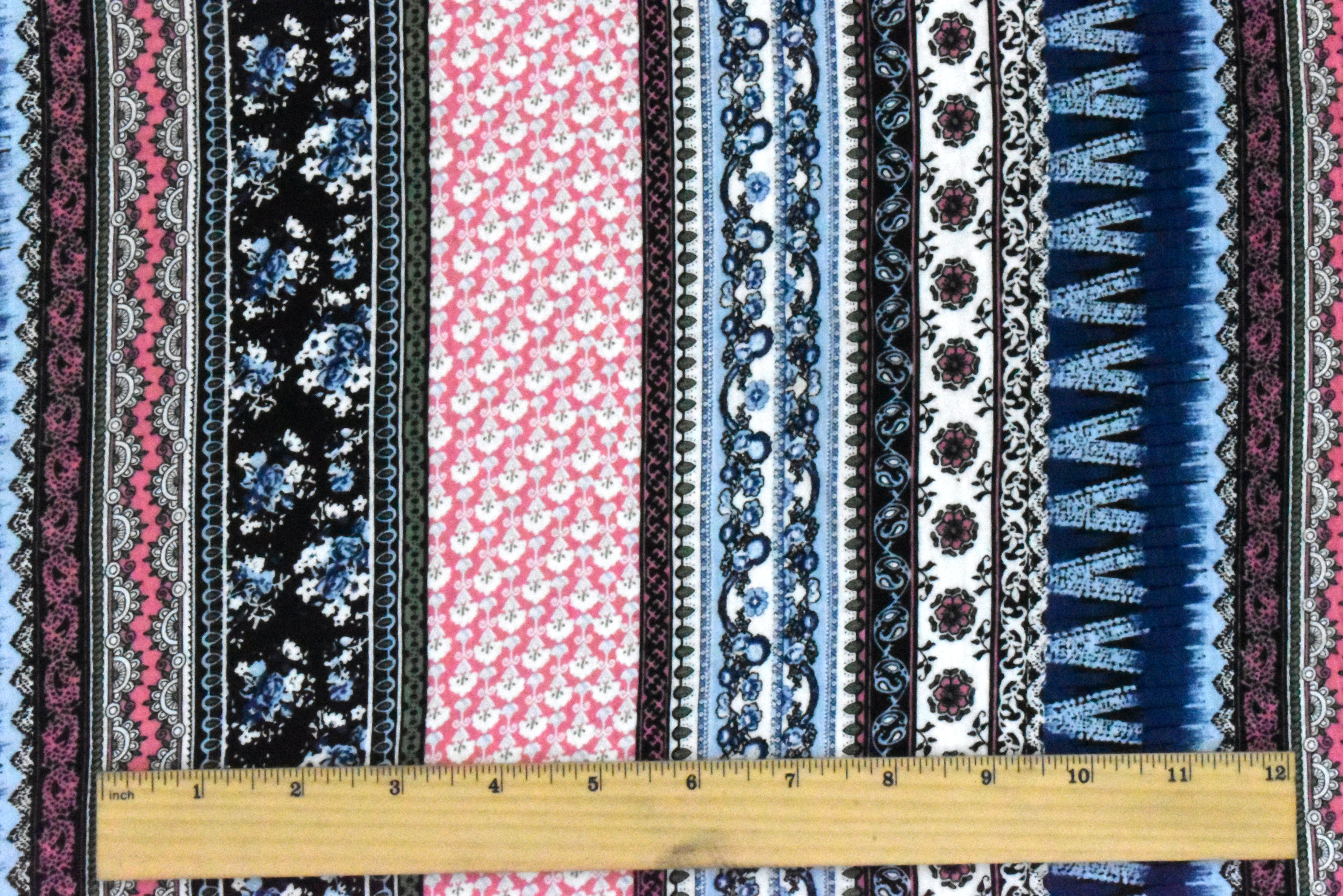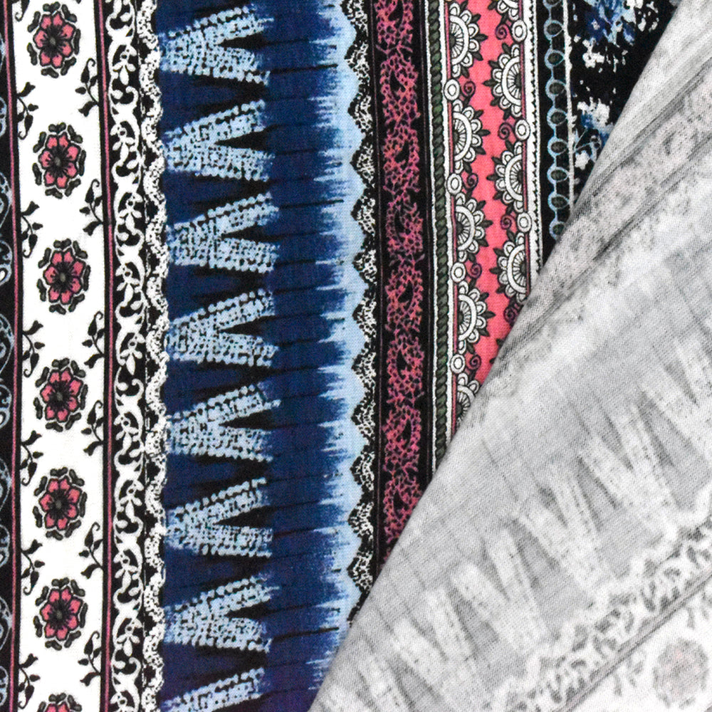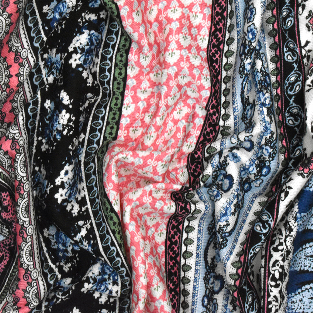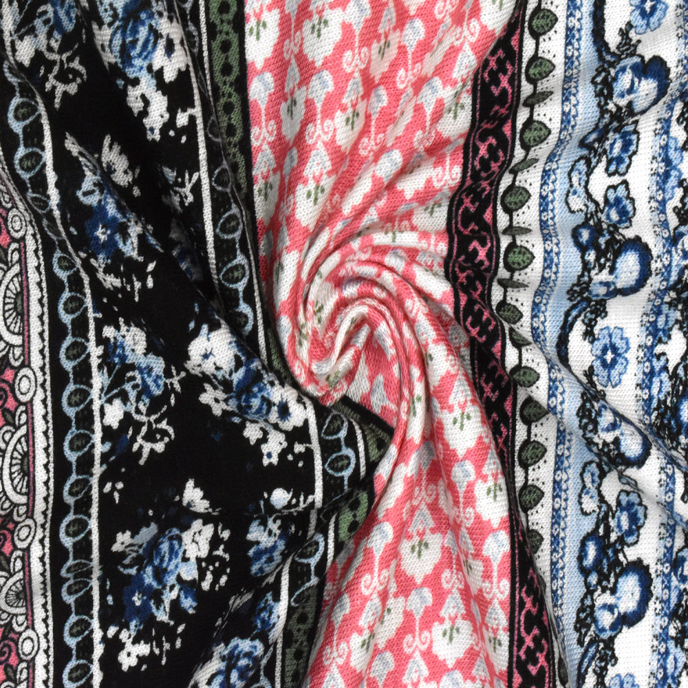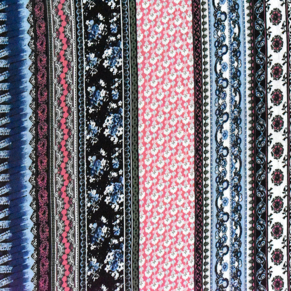 Deep Blue-Pink-Multi Striped Floral Print Rayon Stretch Jersey Knit Fabric