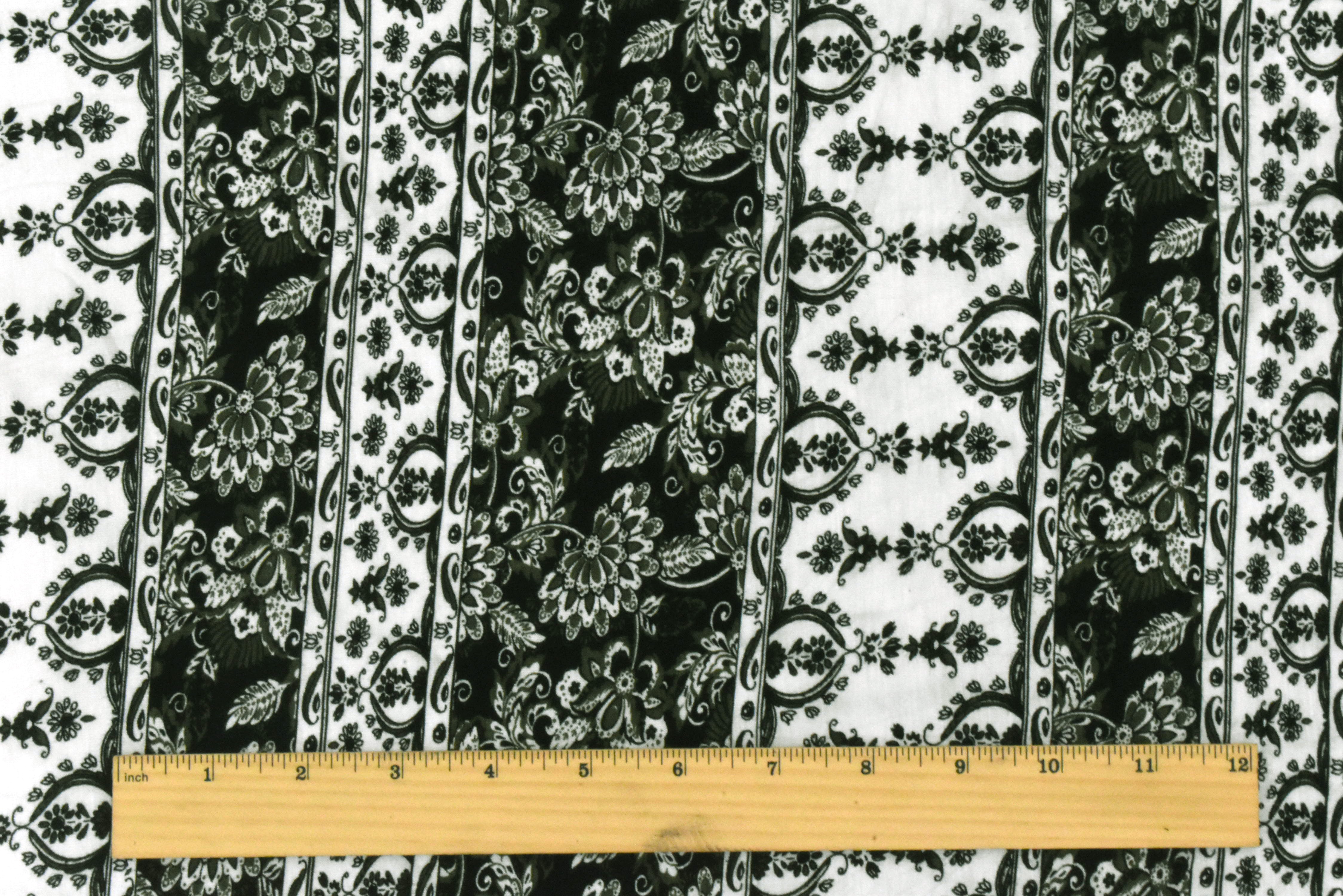 -Rayon slub jersey knit fabric printed with a floral and pillar-like elements in a striped arrangement