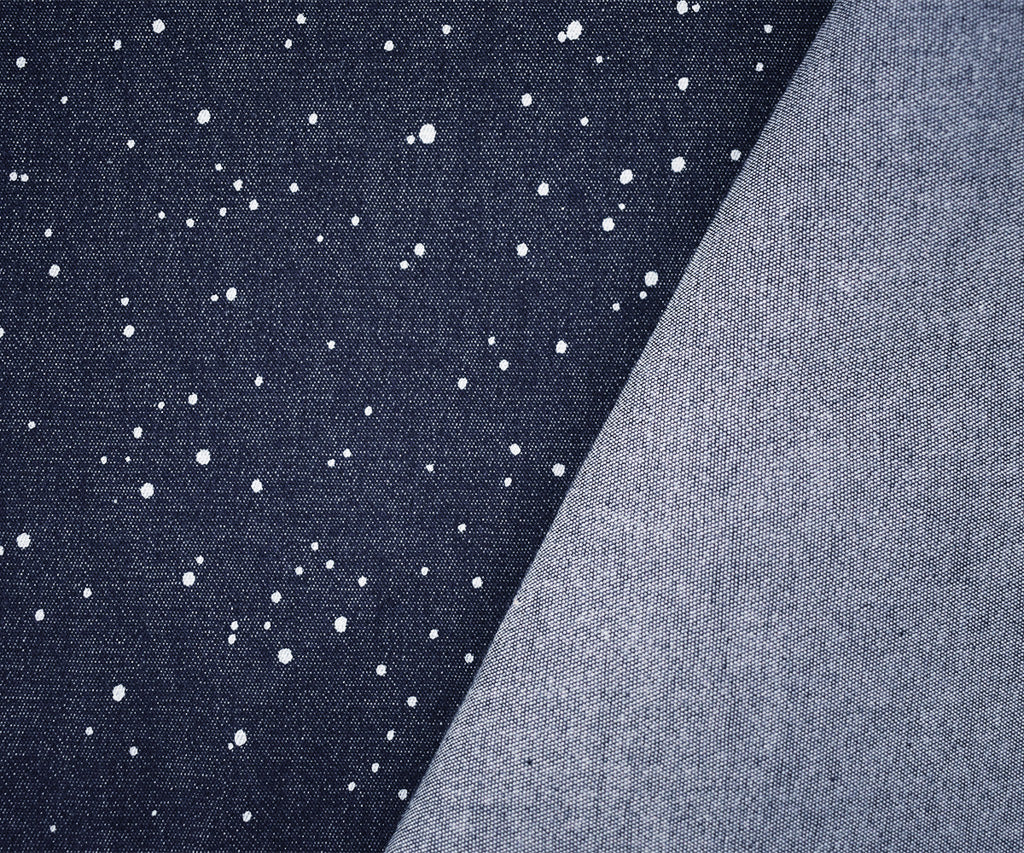 -8 oz. cotton stretch spandex denim fabric printed with random dots and an abstract painterly like motif