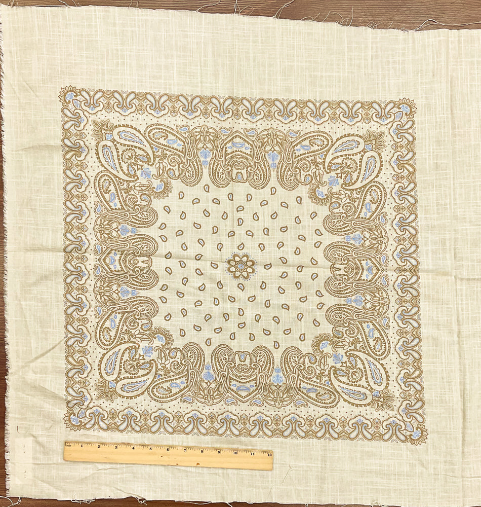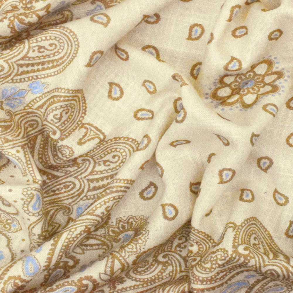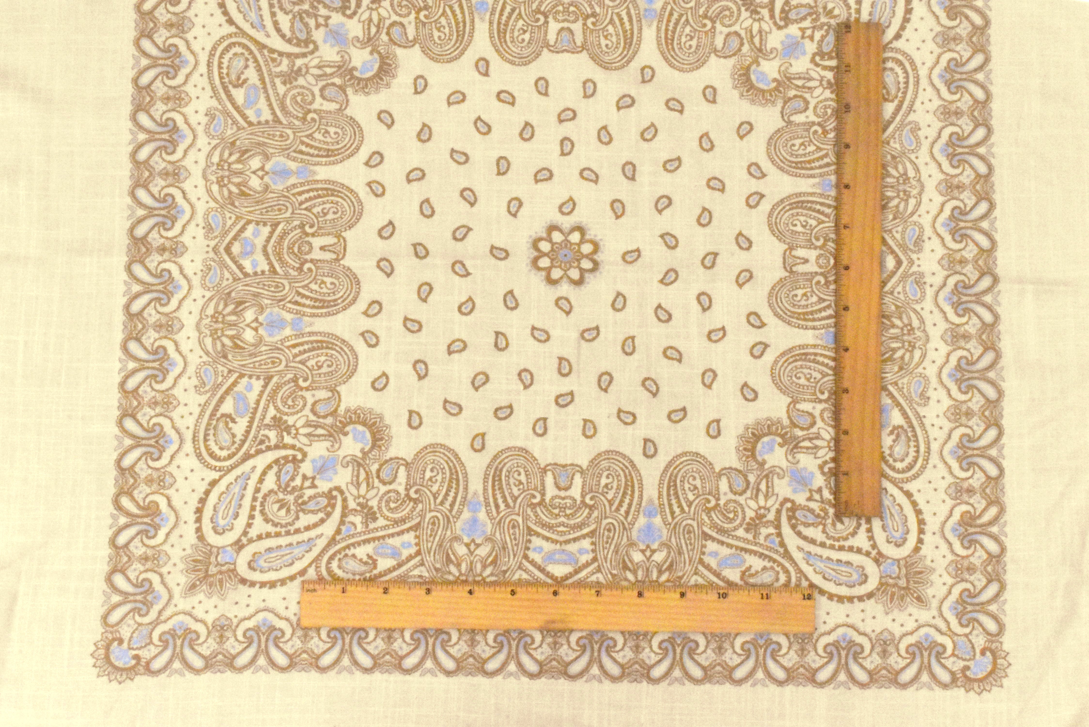 -Famous designer, Paisley border printed viscose cross-hatch textured woven fabric, ideal for scarves. Please note: Each panel will have 2 bordered square pattern print that is approx. 20"x20". Each full panel is approx. 28" x 53"