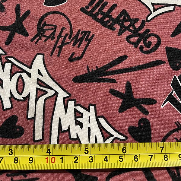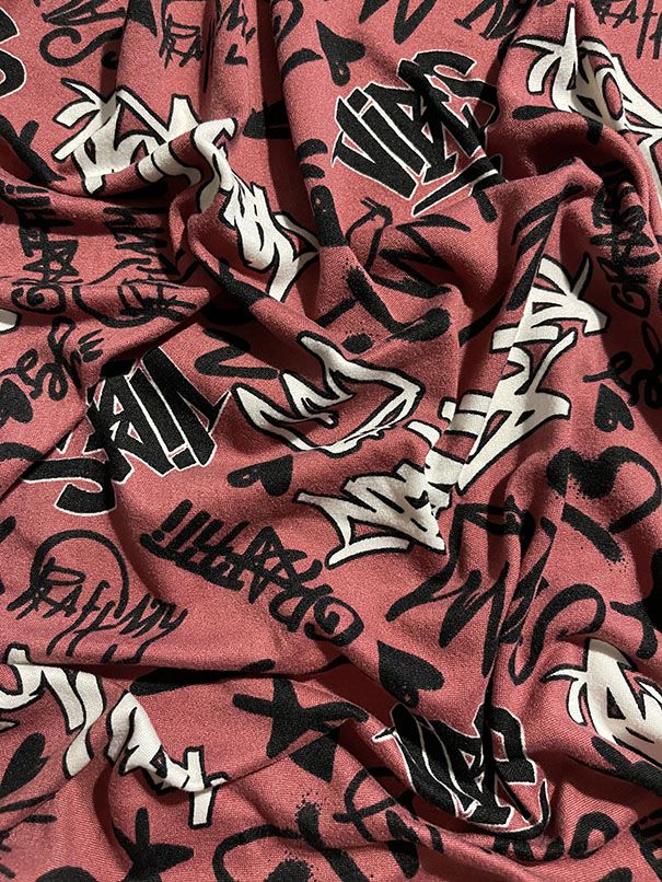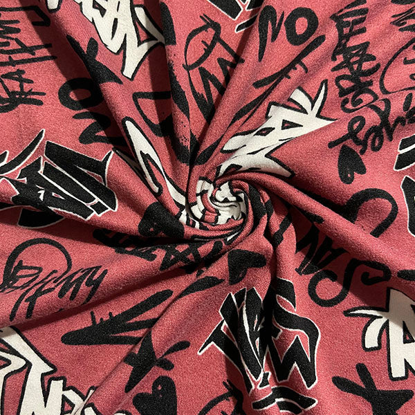 1 YD PC -Mauve, Black, & White Grafitti Print Stretch Double Brushed Knit Fabric
