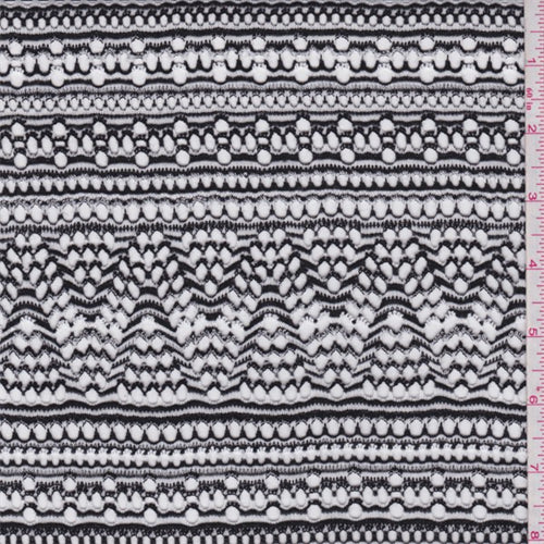 Black and white yarn dyed horizontal stripe polyester knit with decorative holes. Nice drape with a slight stretch in width. Suitable for knit tops and overlays. Sheer, use a lining or underlay when opacity is desired. Machine washable.