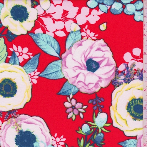 Bright Red Multi Floral Bloom Brushed Jersey Knit Fabric