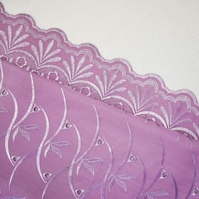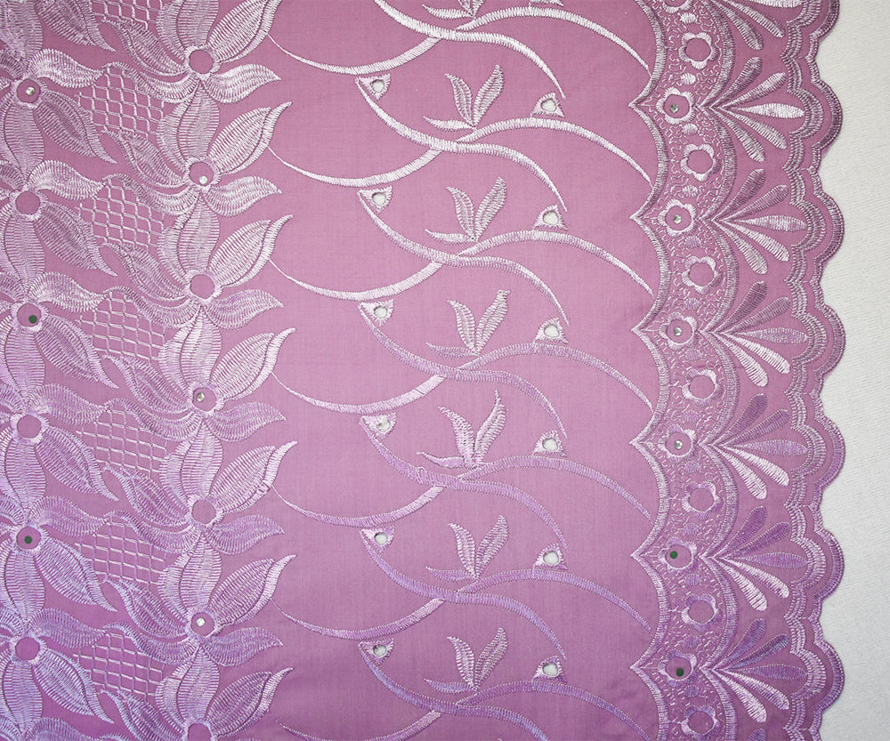 Mauve Purple Poly-Cotton Embroidered Floral Scallop Rhinestone Woven Fabric