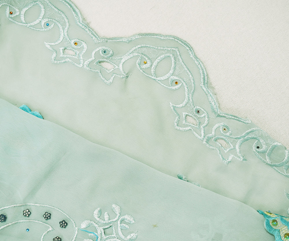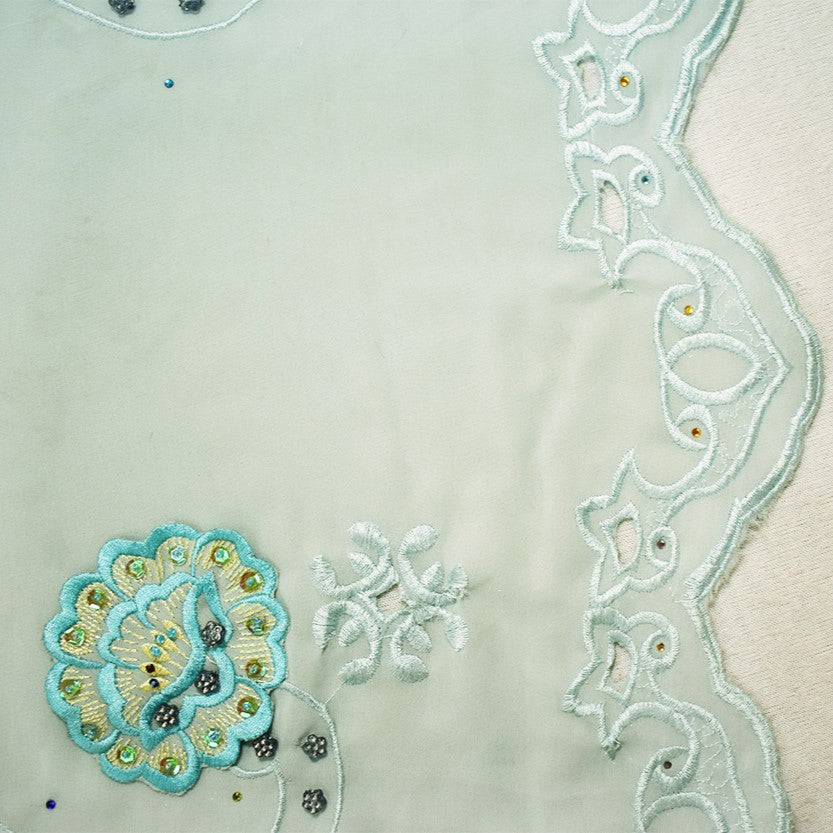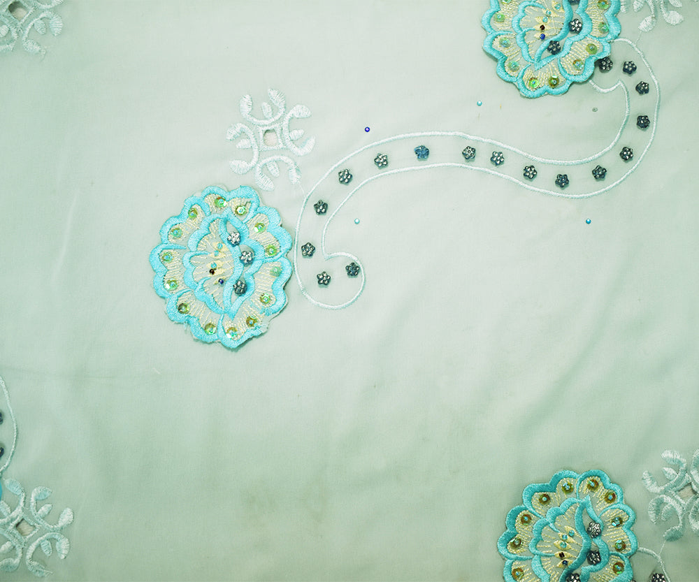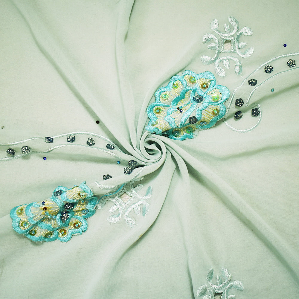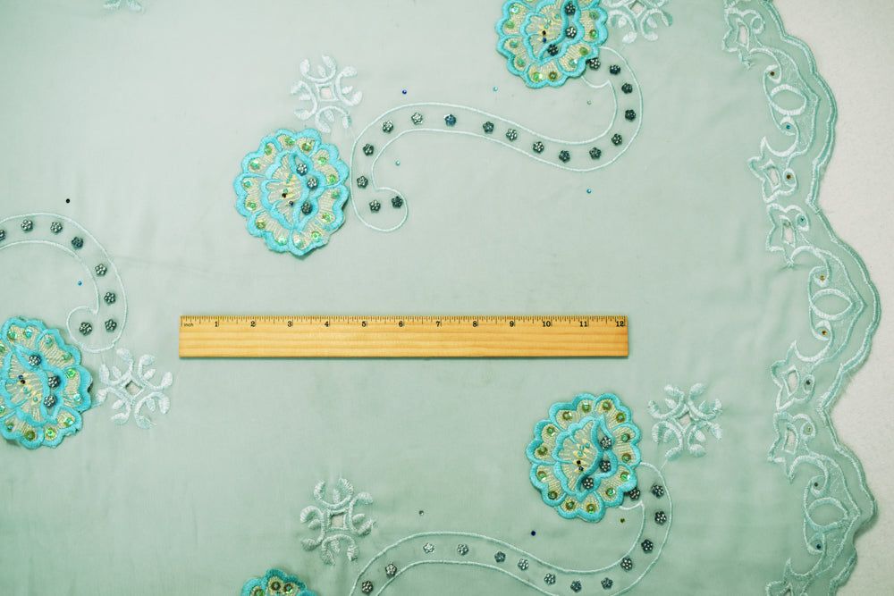 Teal-Multi Poly Embroidered Floral Beaded Rhinestone Scallop Chiffon Fabric