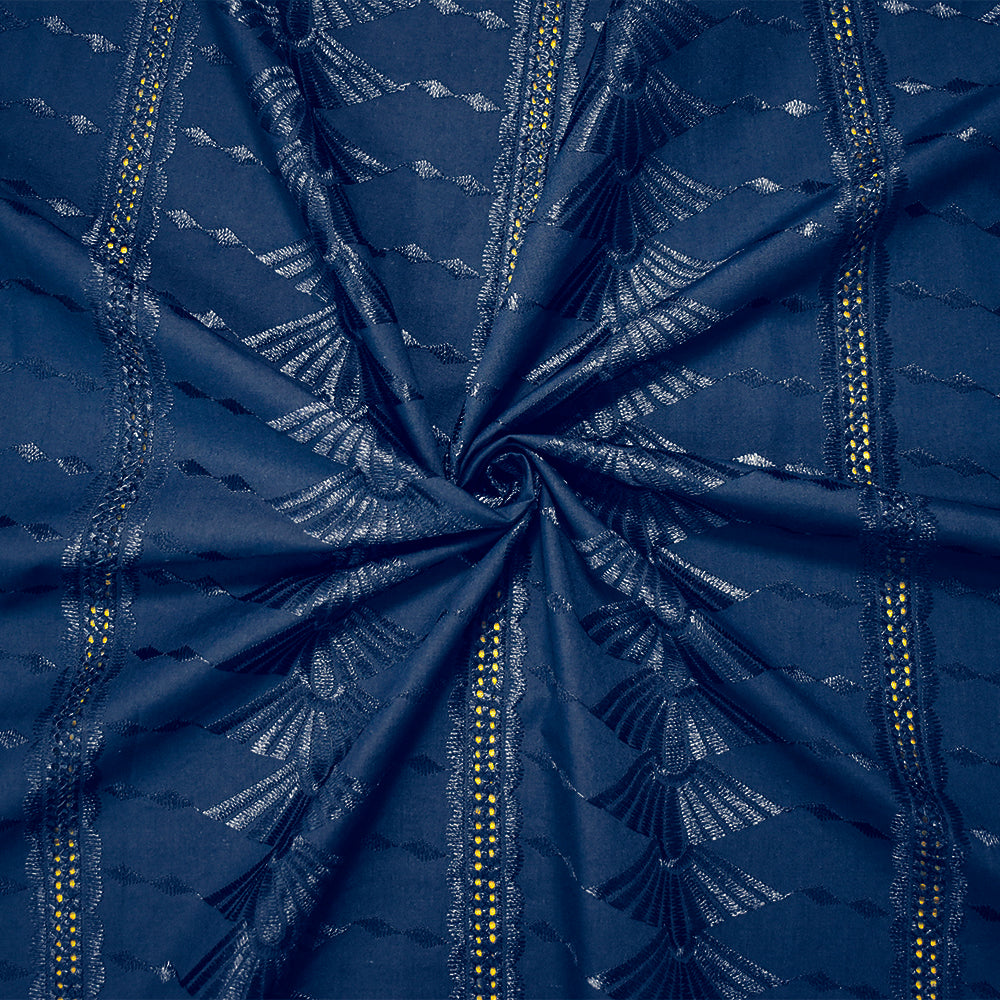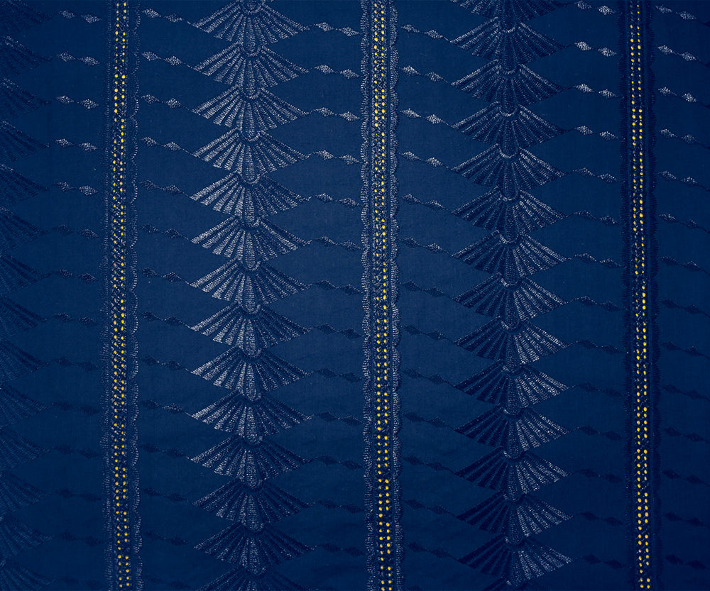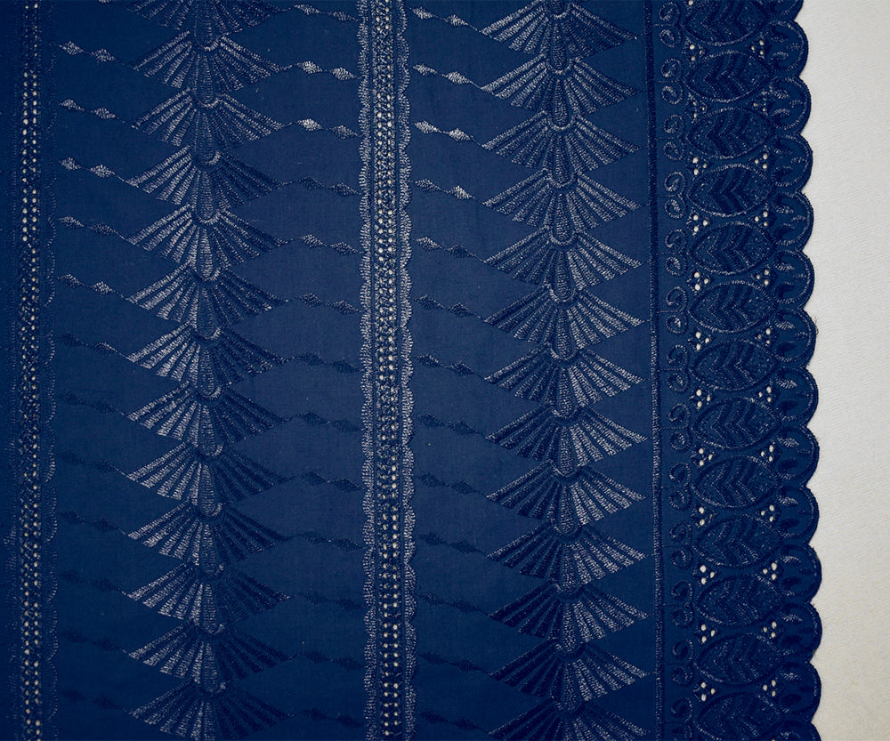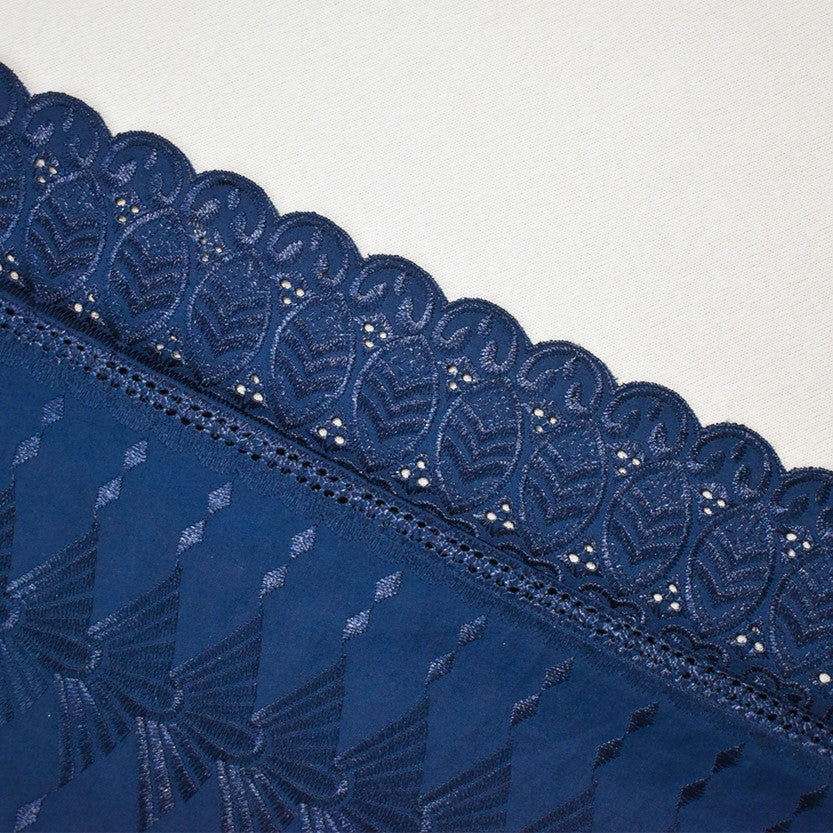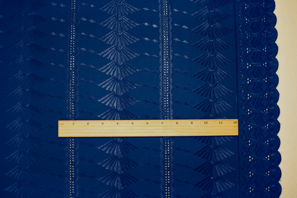 Blue Poly-Cotton Embroidered Geometric Leaves Scallop Eyelet Woven Fabric