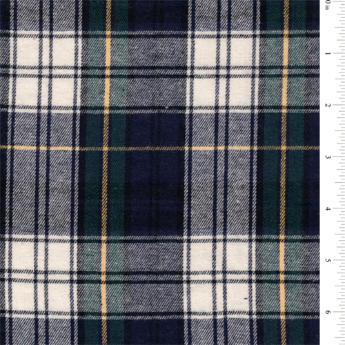 Hunter Green, Navy Blue, Black, Off White, and Yellow Plaid Flannel Fabric