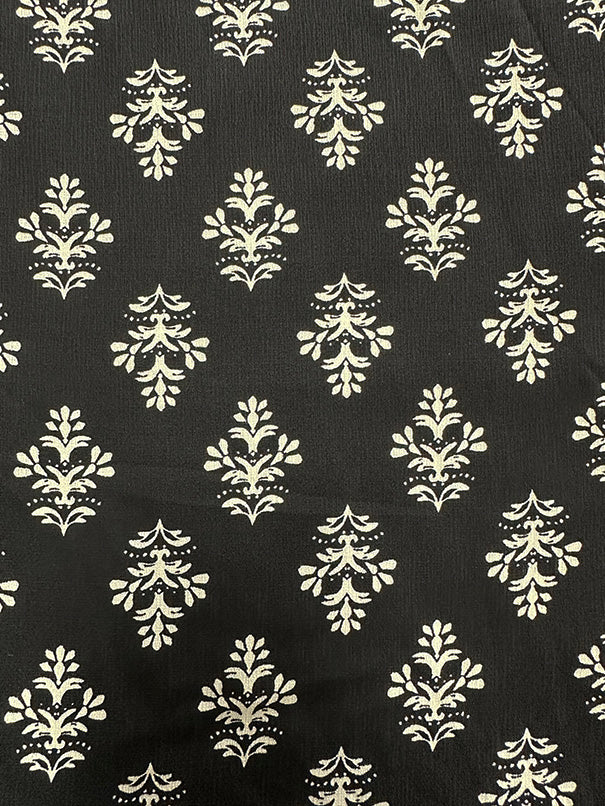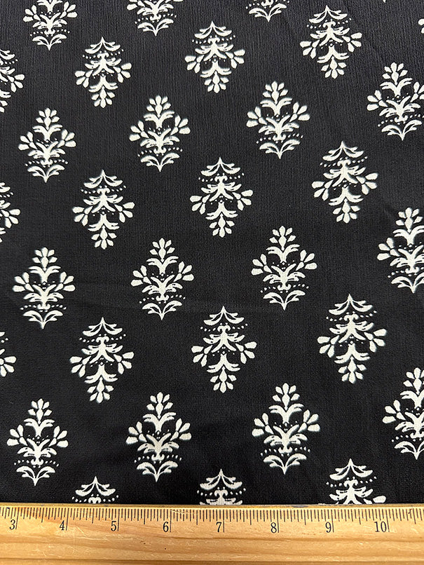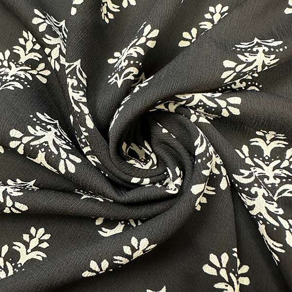 Black and White Floral Medallion Poly Print High Crepe Fabric