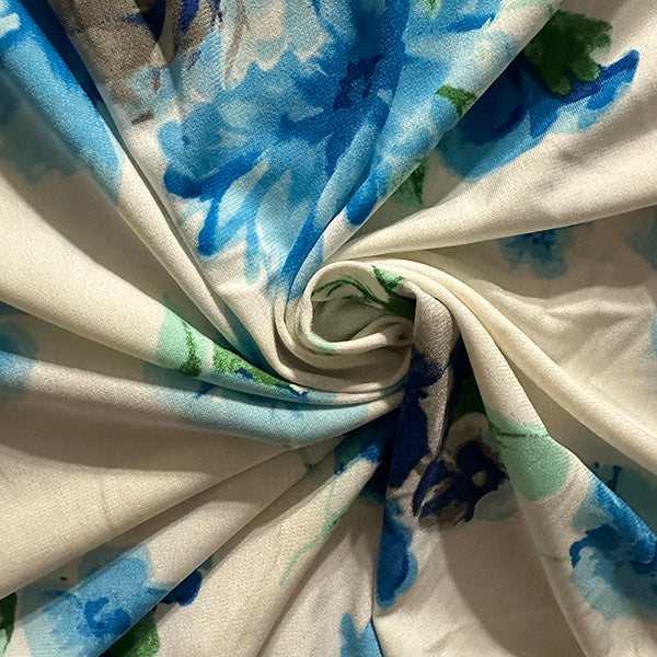 -Blue, Green, Aqua, & Gray Floral Print on Ivory ITY Jersey Knit Fabric