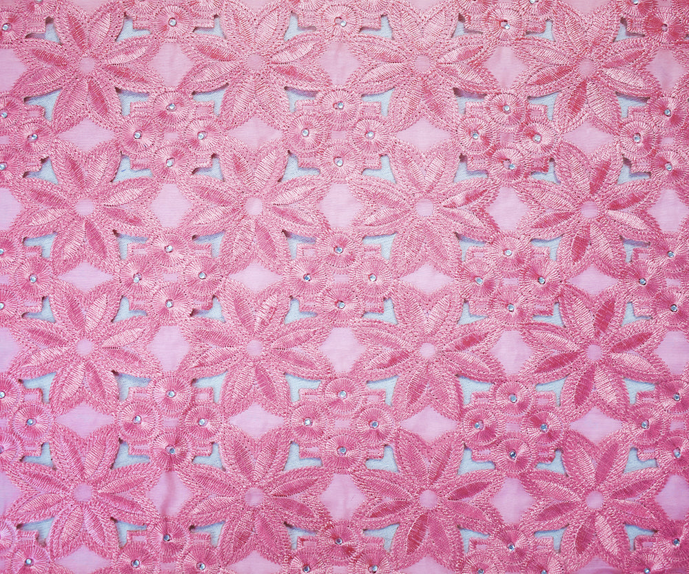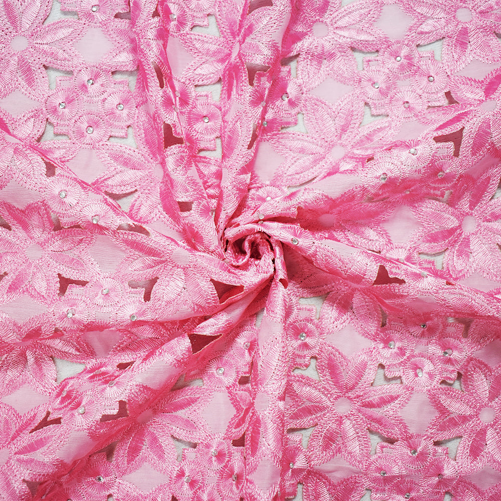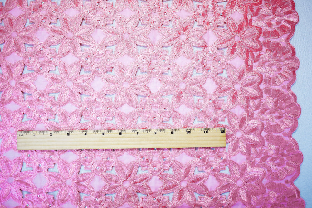 Pink Poly Floral and Circle Embroidered Scallop Rhinestone Woven Fabric