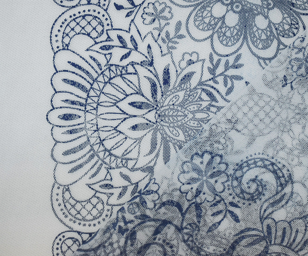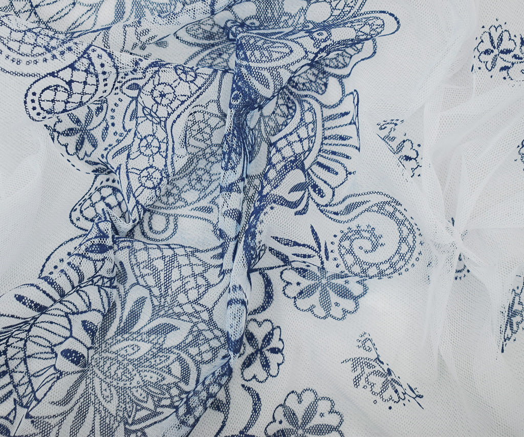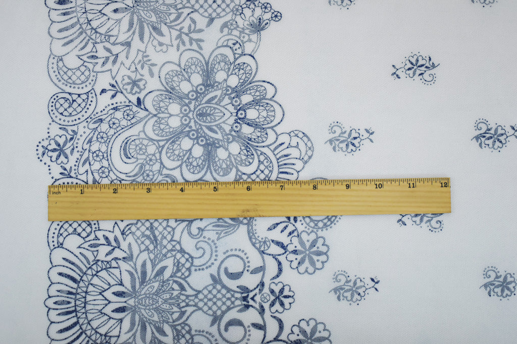 White-Dark Blue Nylon Floral Border Printed Mesh Tulle Fabric