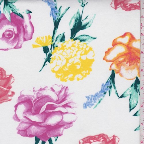 White Multi Large Floral Double Brushed Jersey Knit Fabric
