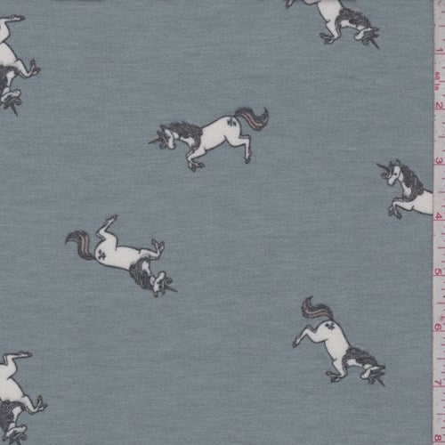 Dusty Blue Leaping Unicorn Brushed French Terry Knit Fabric