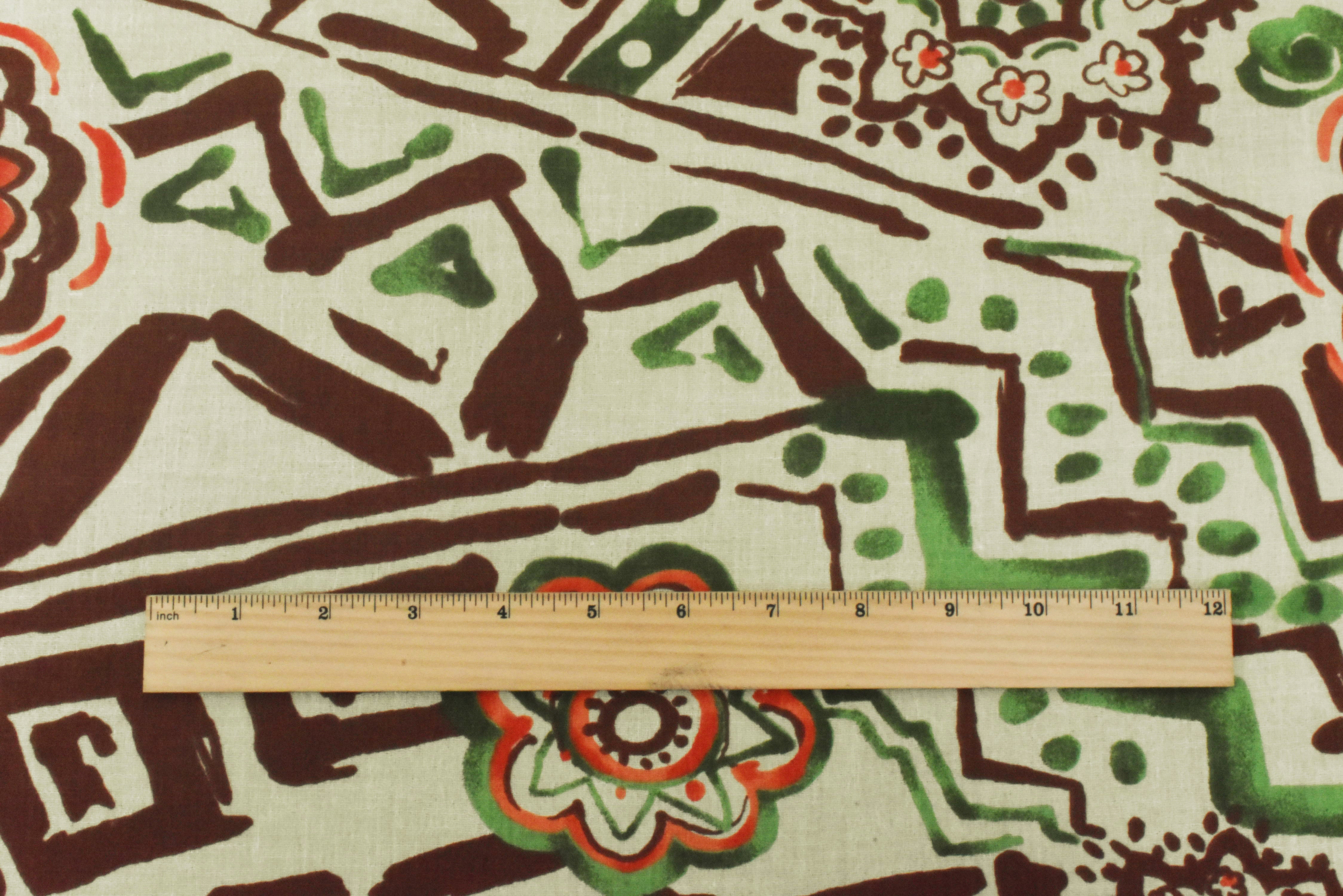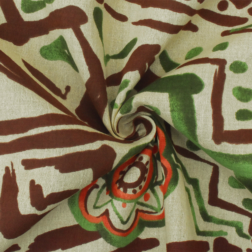 Beige-Green-Multi Aztec And Floral Printed Cotton Gauze Woven Fabric