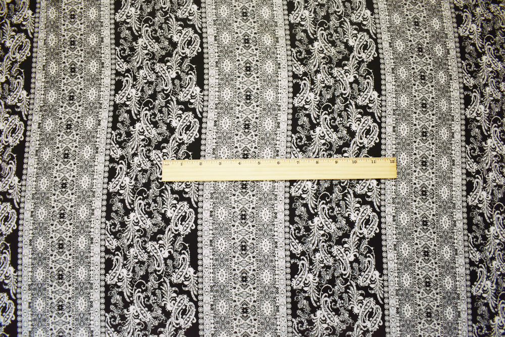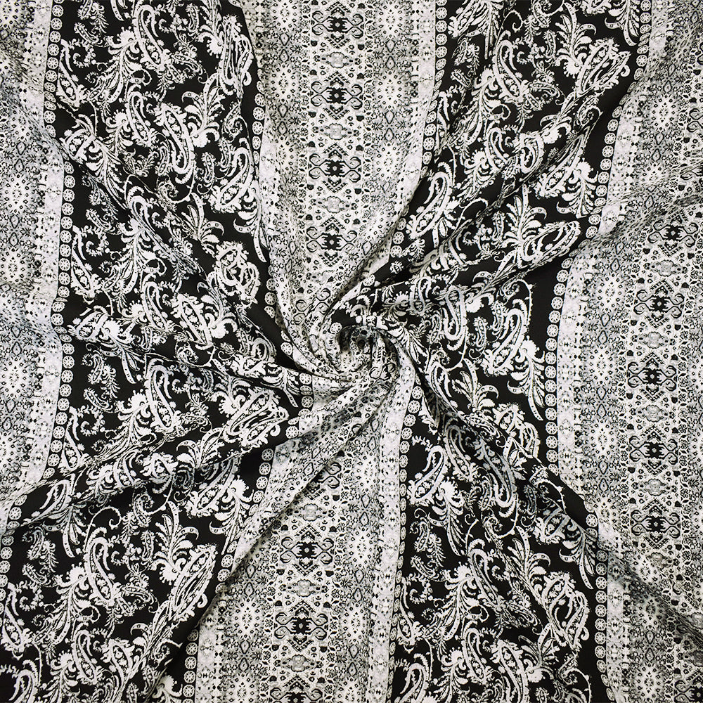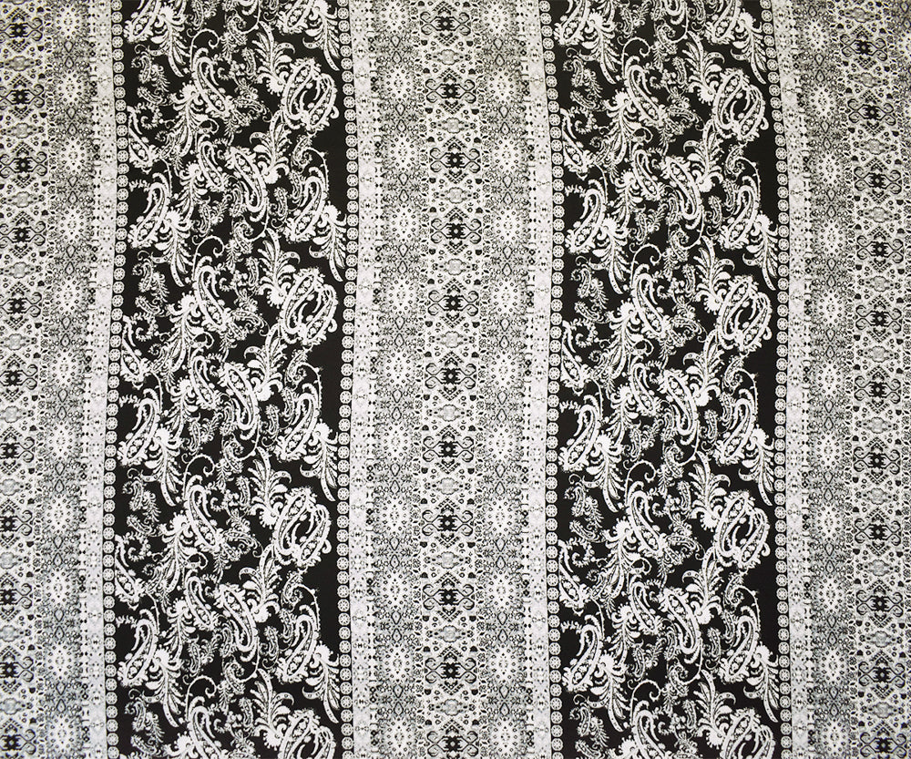 -Black-Gray Poly Paisley Stripe Border Print Momie Crepe Georgette Fabric