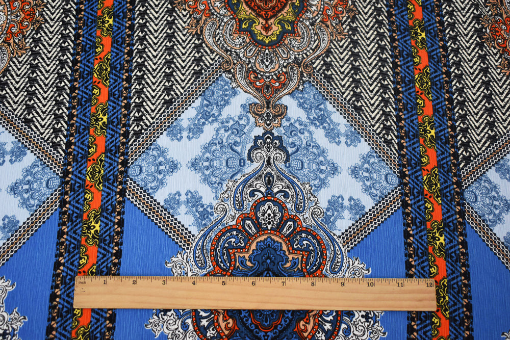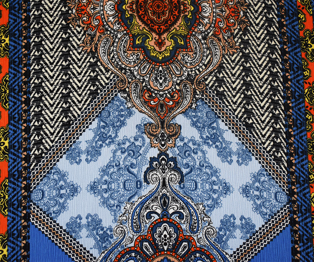 Blue-Orange-Multi Baroque Printed Poly Crepe Georgette Woven Fabric