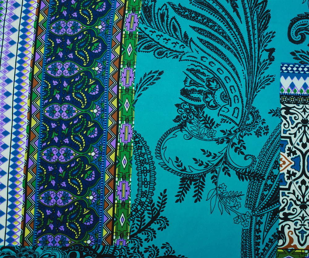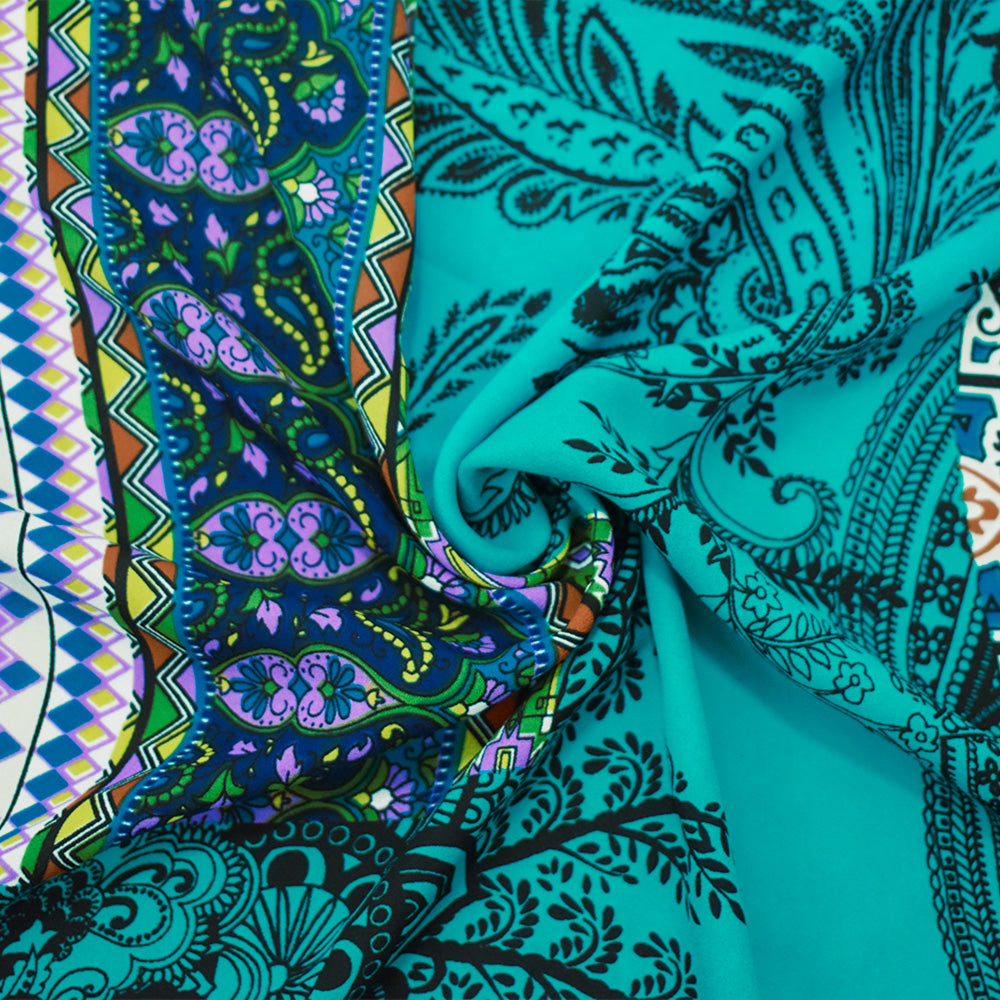 Turquoise-Multi Poly Abstract Multi Pattern Printed Crepe Georgette Fabric