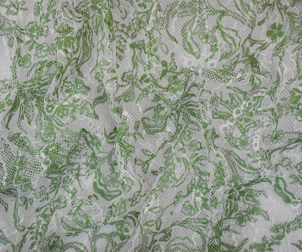 White-Green Nylon Floral Vine Printed Lace Mesh Knit Fabric