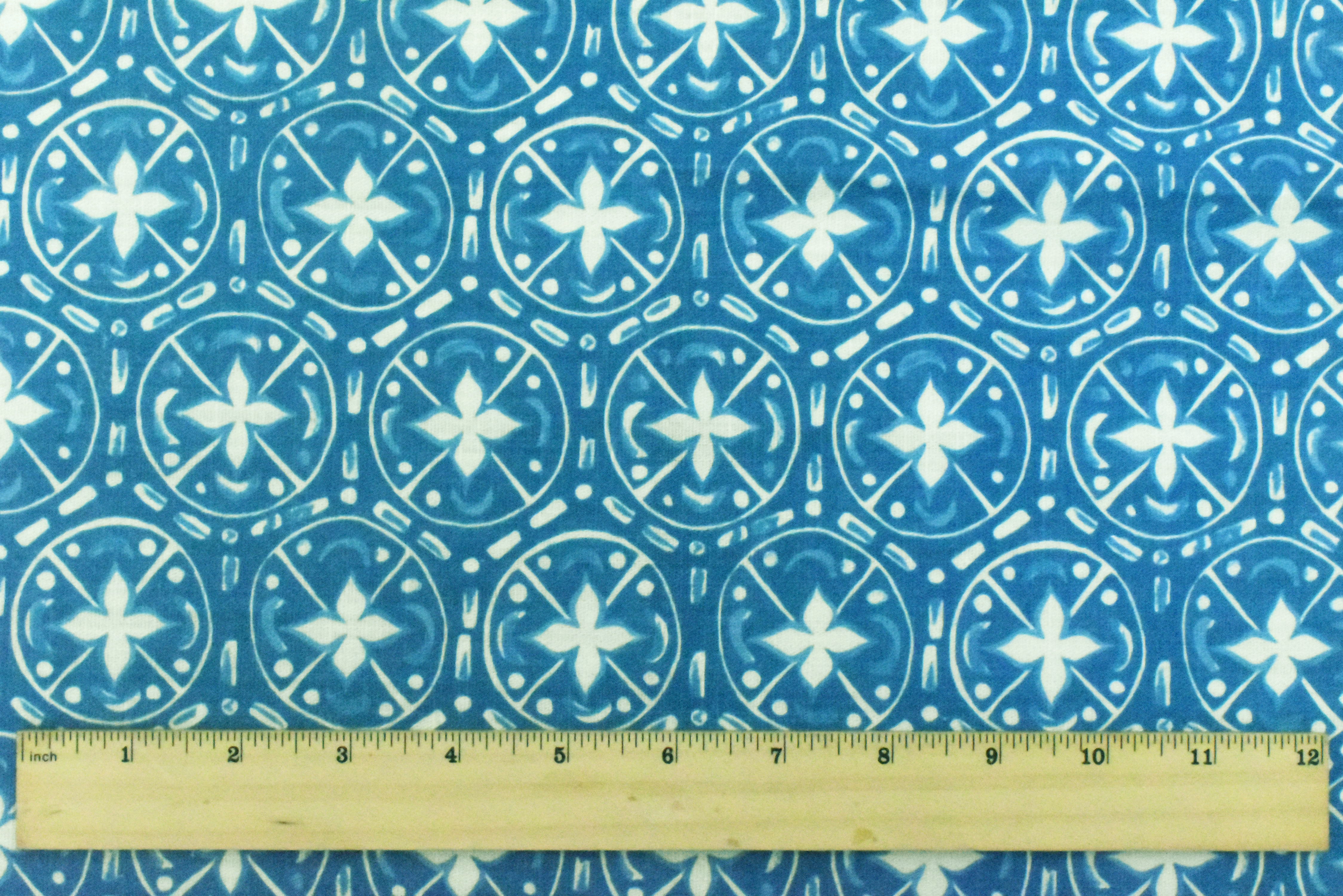 -100% cotton slubbed woven fabric printed with a tile-like morrocan inspired pattern