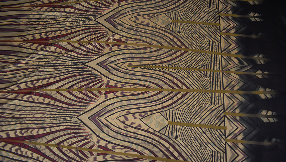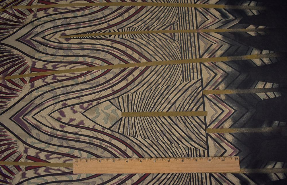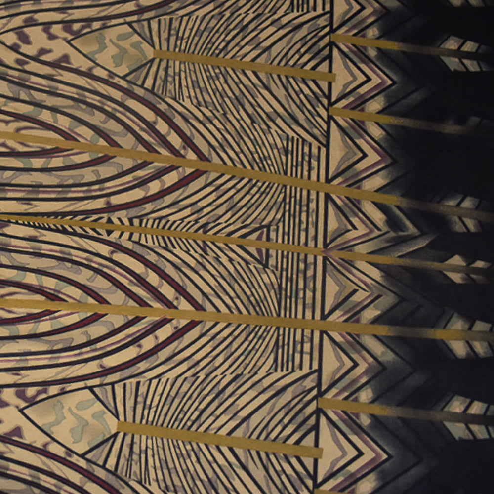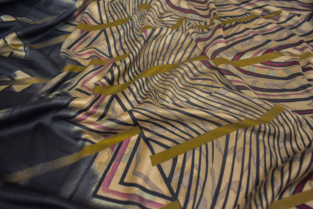 -100% silk jersey knit fabric printed with an Aztec inspired pattern with a side border, line if needed.
