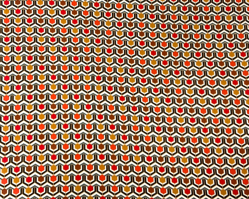 -Brown-Multi Poly Spandex Stretch Retro Hex Print Single Sided Brush Jersey Knit Fabric