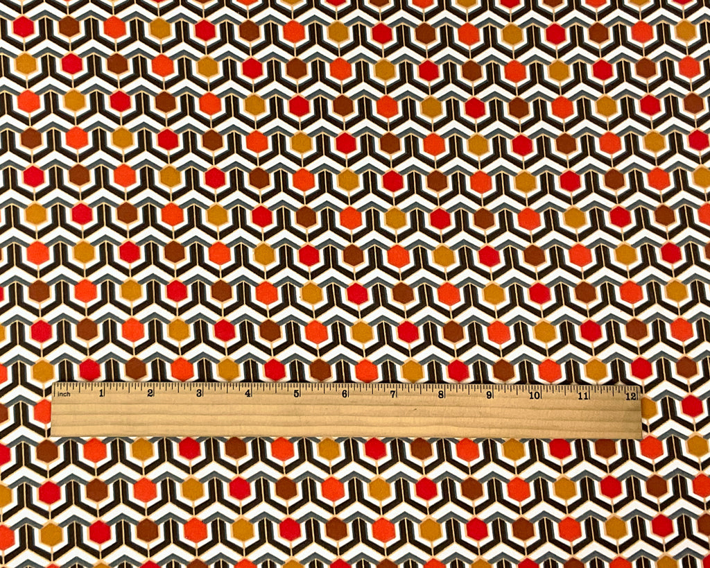 Brown-Multi Poly Spandex Stretch Retro Hex Print Brushed Jersey Knit Fabric