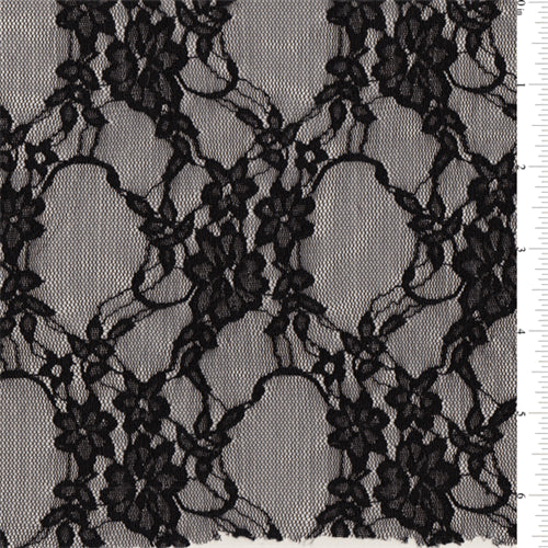 Black floral stretch lace fabric. This light weight sheer lace fabric has ample 4 way stretch and recovery.